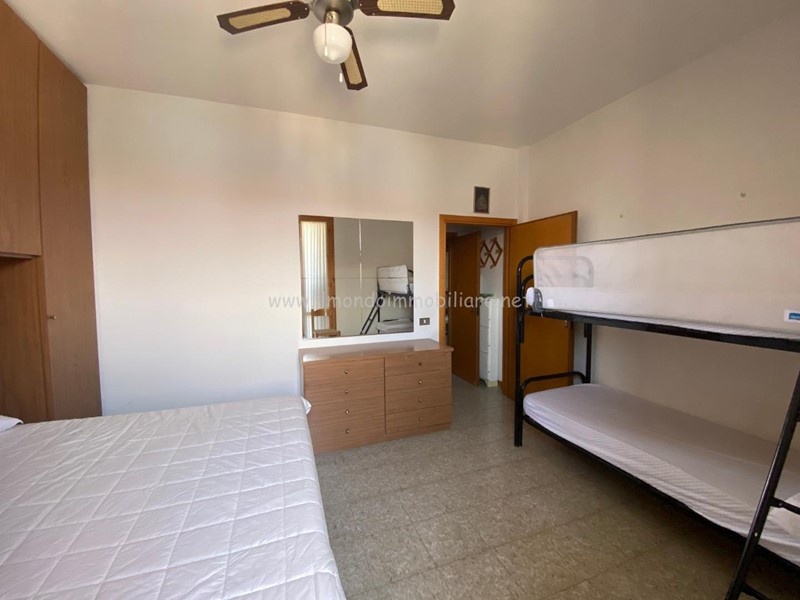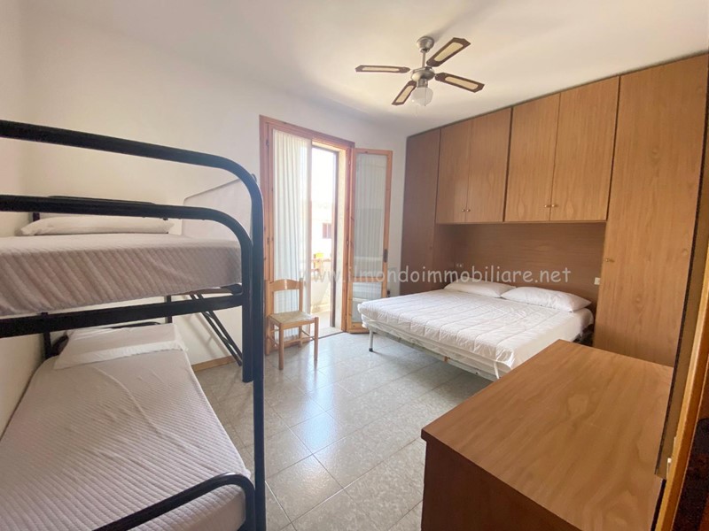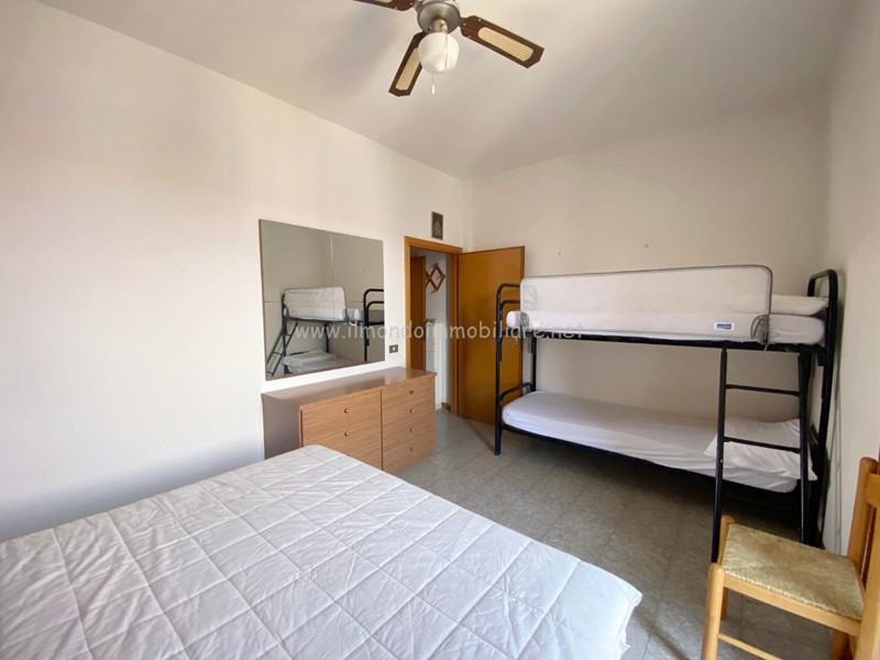 Cucina soggiorno con divano letto, camera matrimoniale con balcone e letto a castello, bagno con finestra