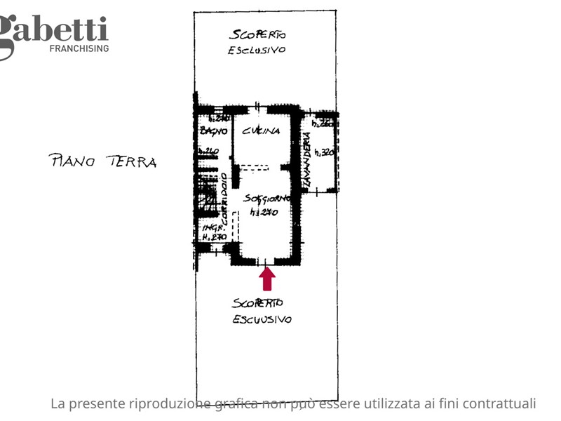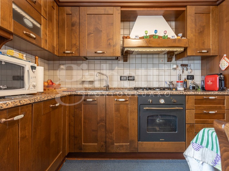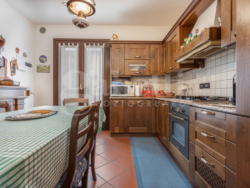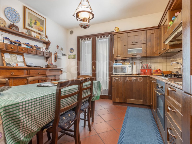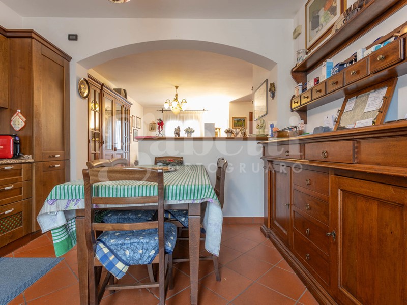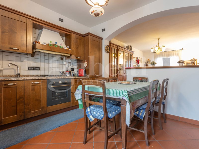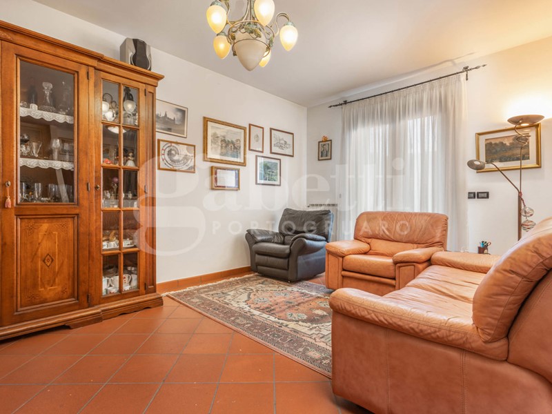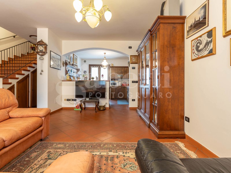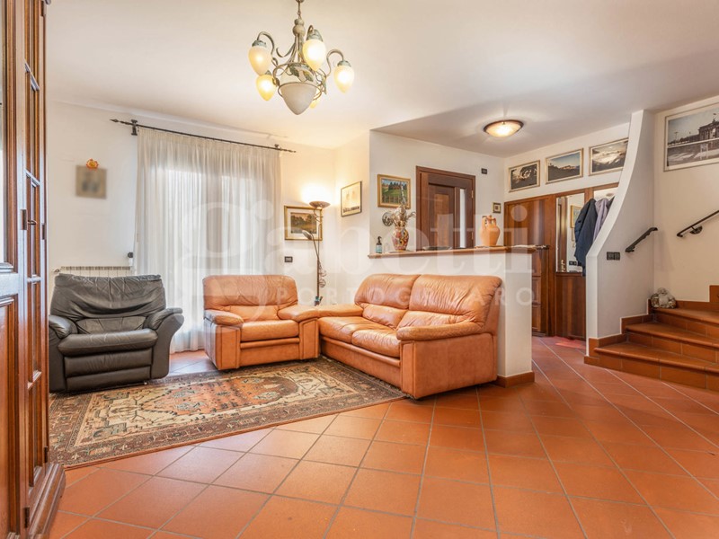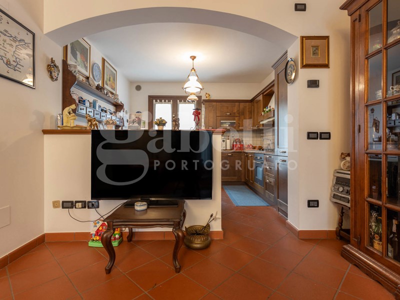 L'abitazione dallo stile classico, impreziosita da pavimenti in cotto, si compone al piano terra da un ampio e luminoso soggiorno con cucina a vista ed accesso diretto al giardinetto sul retro più un bagno con vasca.