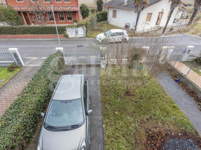 Ad accoglierci troviamo il giardinetto antistante all'abitazione con accesso carrabile motorizzato che conduce al portico dove poter riparare l'auto.