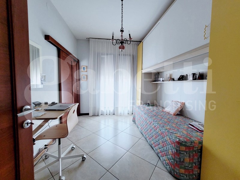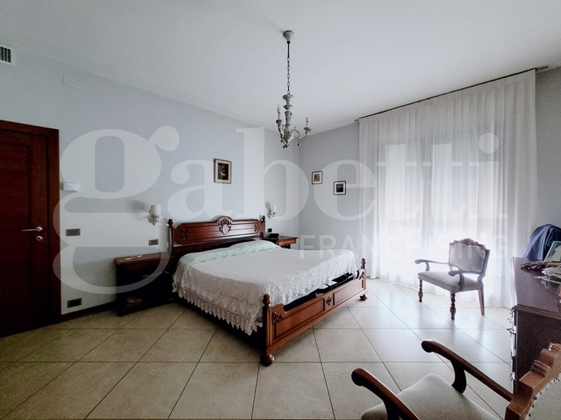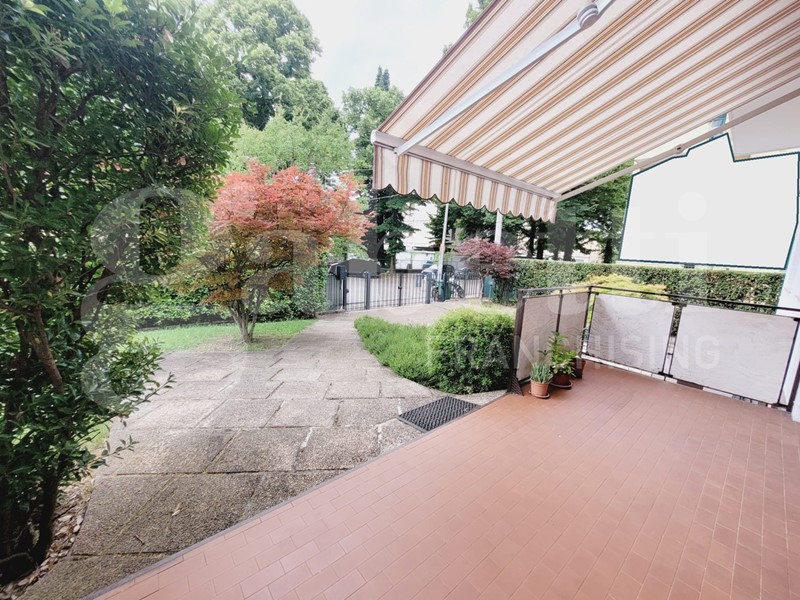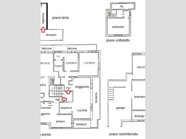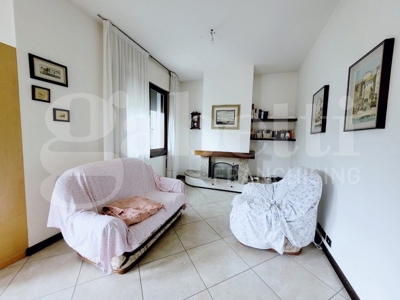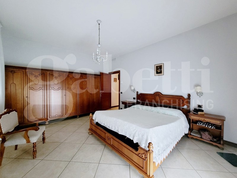 La seconda abitazione si compone di soggiorno con caminetto ed angolo cottura con accesso al terrazzo, studio, camera matrimoniale, bagno, lavanderia e 2 balconi; mediante scala interna si può accedere alla soffitta. Al piano seminterrato troviamo un garage di 36 mq, lavanderia, ripostiglio e disbrigo. Di proprietà inoltre, troviamo 250 mq di giardino.