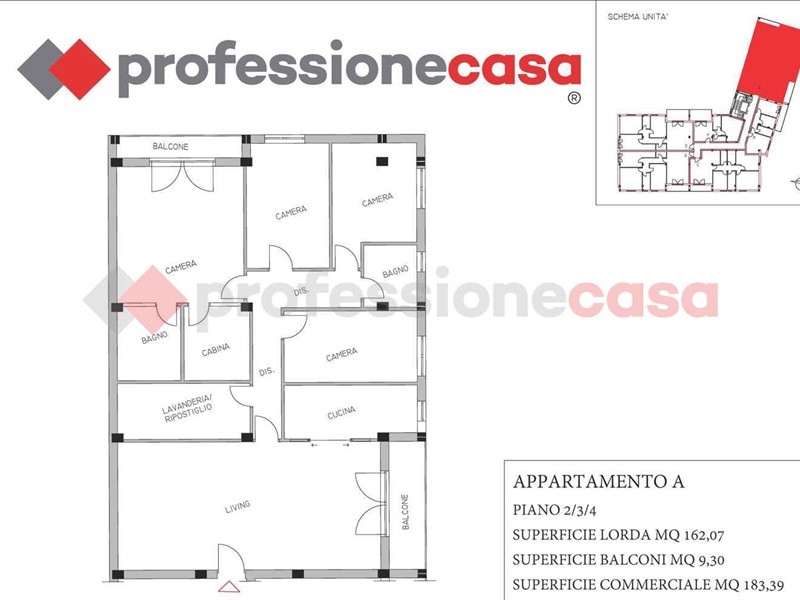 Tipologia 5 LOCALI, composizione: ingresso in soggiorno, cucina, camera patronale con balcone, bagno privato e cabina armadio, 3 camere da letto, bagno, ripostiglio/lavanderia e balcone.