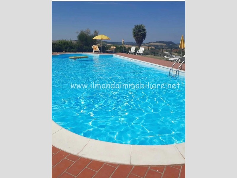 Accesso a piscina condominiale con lettini e ombrelloni per rinfrescarsi nelle calde giornate estive.