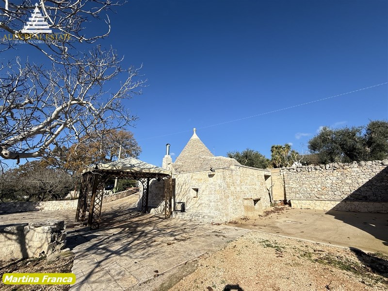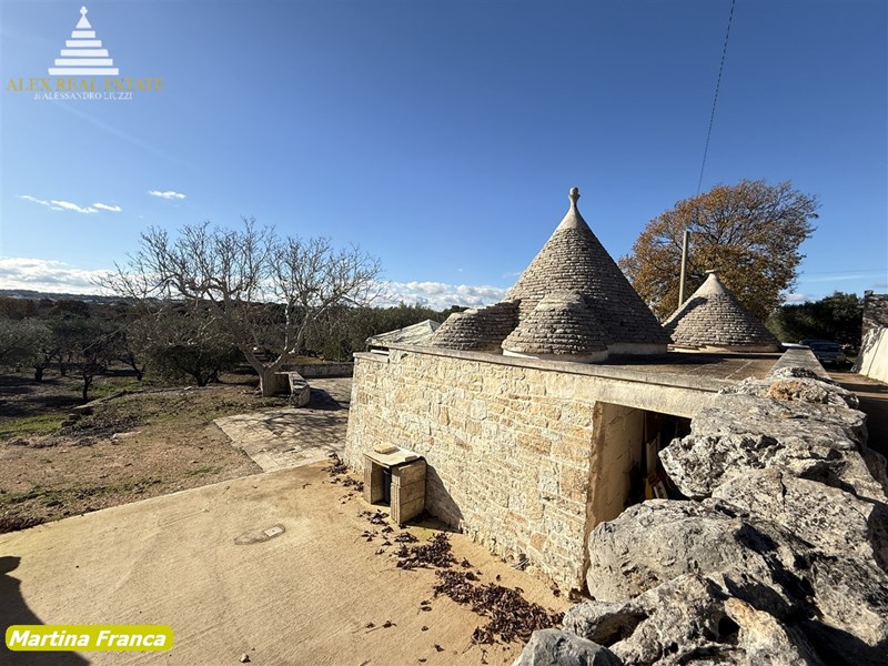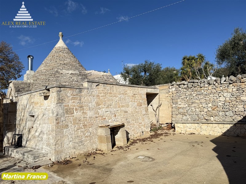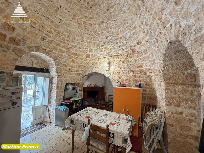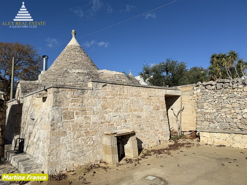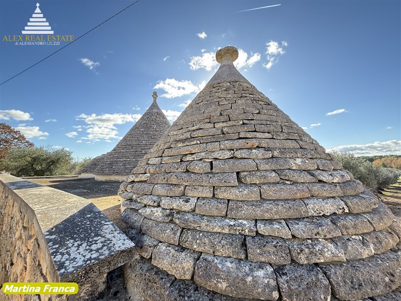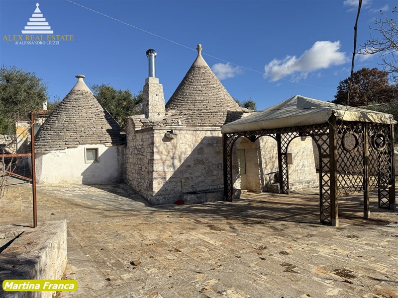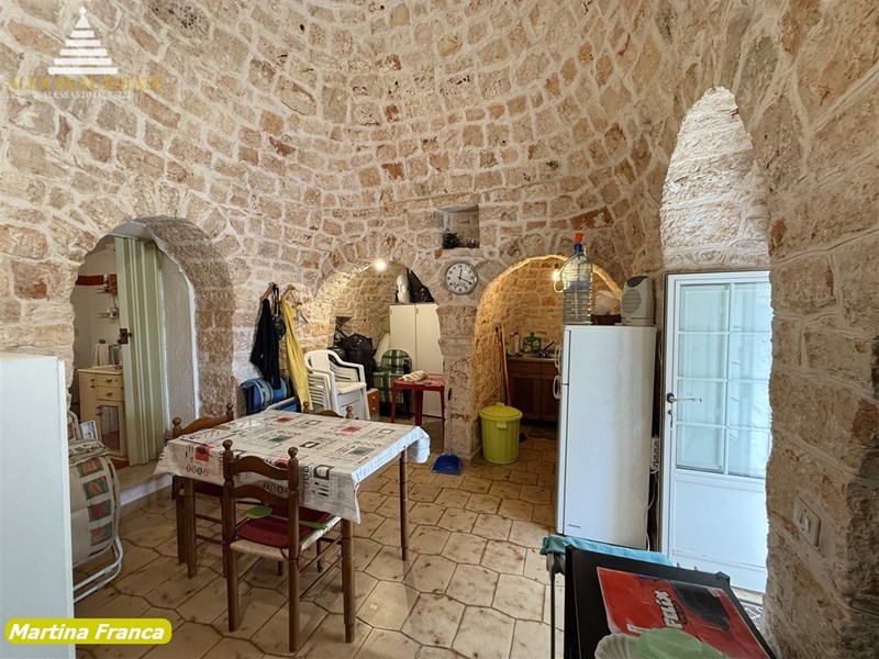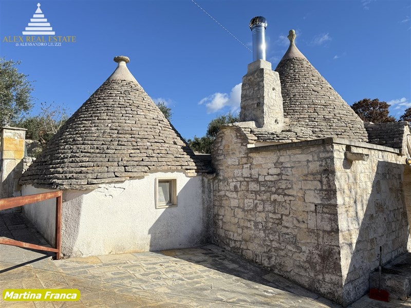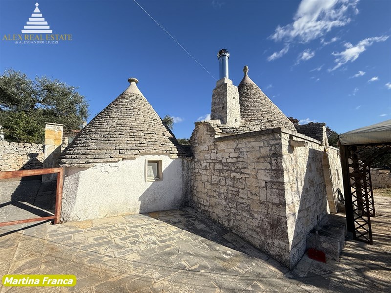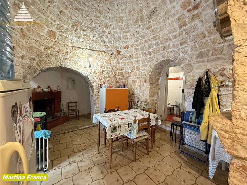 Descrizione: il gruppo di trulli comprende un cono di ingresso centrale, un'alcova dove c'è una piccola cucina, una seconda alcova, una terza alcova con camino, un bagno e un piccolo trullo che funge da disimpegno per accedere al trullo laterale dove c'è la camera da letto.