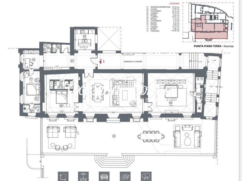 L'appartamento in questione si trova a piano terra e vanta una metratura di 405 mq circa con bel terrazzo di 175 mq collegato al salone, piu' giardino privato di 166 mq, la sua composizione interna si articola da ingresso, ampia cucina, salone di 72 mq, tre camere facente parte la padronale di 55 mq, studio, lavanderia, e quattro bagni. A completare la proprieta' troviamo un' ampia cantina e posti auto.