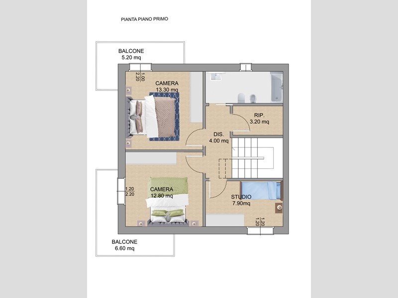 Il villino, così progettato, è suddiviso su due livelli. Al piano terra si ha un open space con soggiorno e cucina, e un bagno finestrato. Al piano primo, troviamo due camere da letto matrimoniali con balcone, una cameretta studio e un bagno.