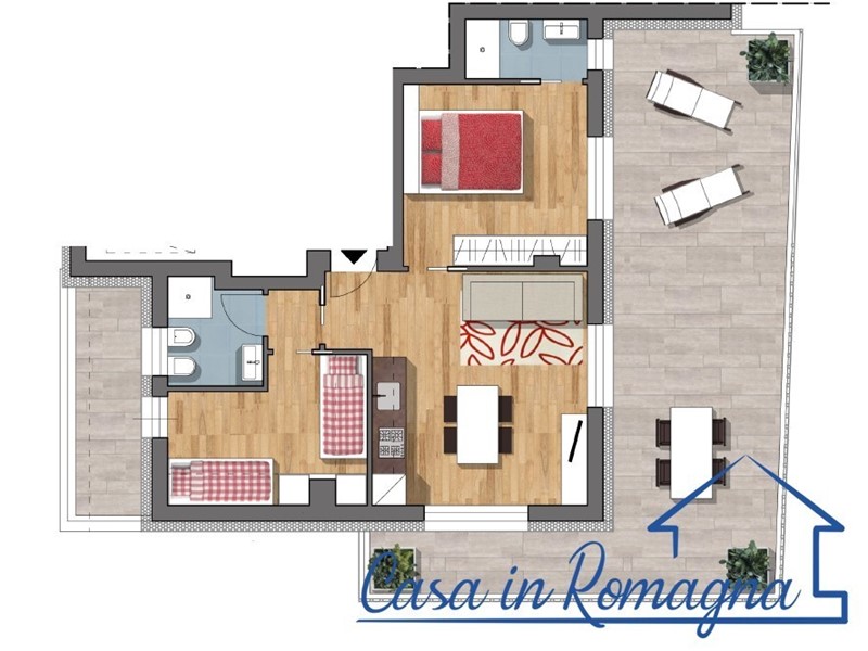 L’ingresso si apre su un luminoso soggiorno con angolo cottura, che si affaccia su un ampio terrazzo loggiato. La zona notte comprende due camere matrimoniali, entrambe con balcone, e due bagni finestrati, di cui uno privato nella camera principale.