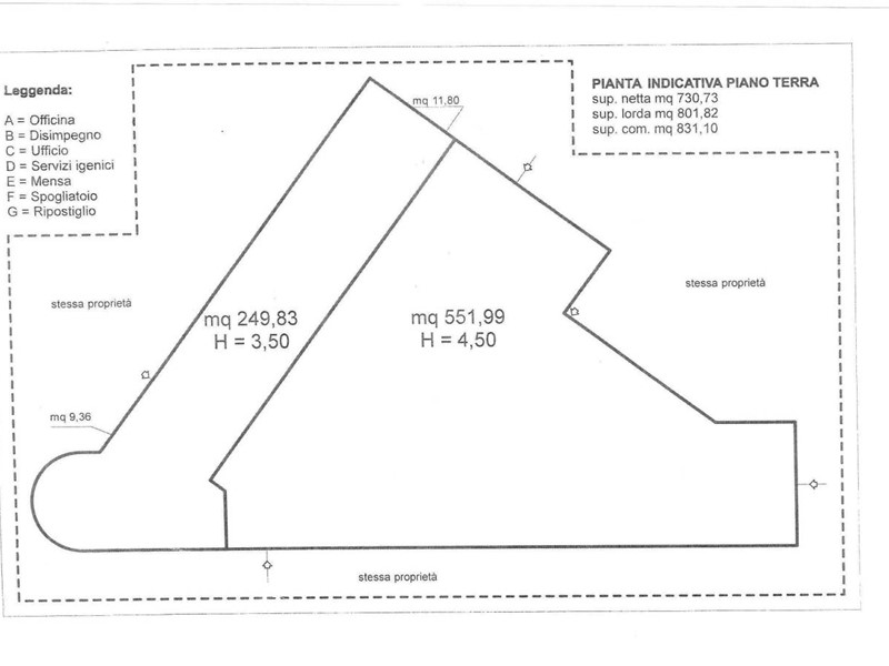 Capannone Artigianale / industriale di mq,800 di cui mq.516 area officina e i restanti ripartiti tra, uffici, servizi igienici, locale mensa, locale spogliatoio, ripostiglio. Completano la proprietà aia di parcheggio di mq.1302,64 + area verde di mq. 902,66.Ubicato in zona semicentrale e vicina ai servizi.