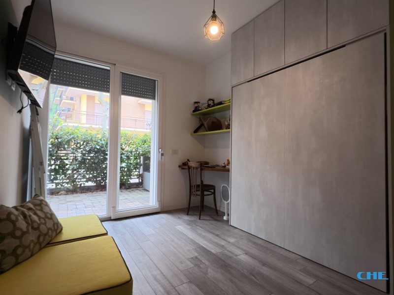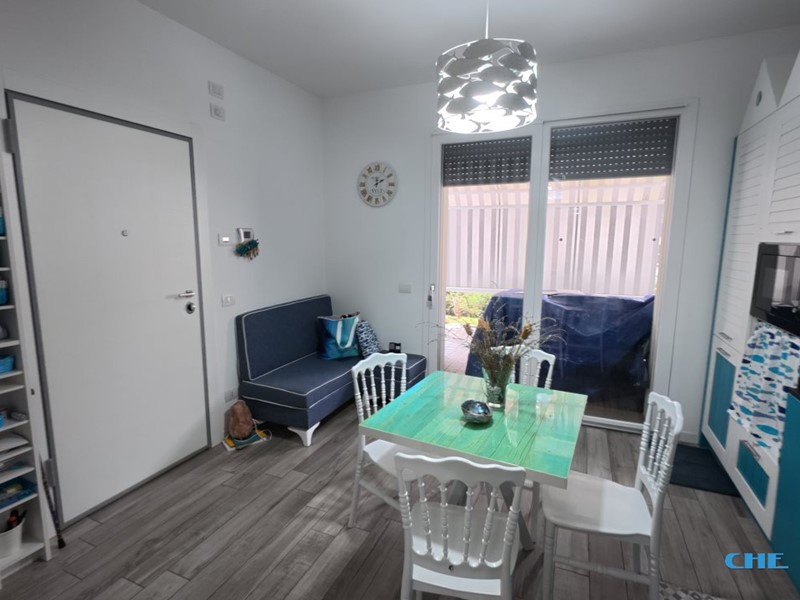 Proponiamo a Gabicce Mare, in zona centrale a pochi passi dal mare e dai principali servizi offerti dal comune, bilocale al piano terra composto da soggiorno con cucina, bagno, camera da letto, e due terrazzi, con garage pavimentato con box doccia e cantinetta a completare la proprietà al piano interrato. L'immobile è posto in un contesto condominiale di sole 4 unità abitative, è stato costruito nel 2019 ed è dotato dei migliori comfort attuali, quali pannelli solari sui tetti e pompa di calore senza alcun allacciamento al gas, collegato esclusivamente alla rete elettrica, riscaldamento a pavimento, serrande e tende da sole elettriche, impianto di allarme con videosorveglianza, addolcitore per l'acqua. Assicurazione decennale sul fabbricato ancora attiva.\nPer avere ulteriori informazioni, contattare l'agenzia immobiliare CheCasa! di Morciano al numero 0541 85 80 82. - Maggiori Dettagli: Sistema di allarme, A pochi passi dalla spiaggia
