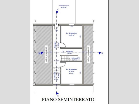 • Piano seminterrato: Corridoio-disimpegno, due locali di sgombero, ripostiglio sottoscala e resede esclusivo tergale.