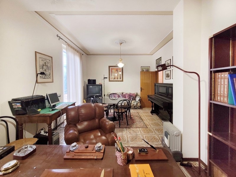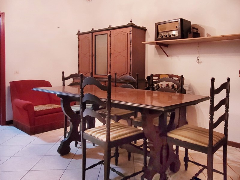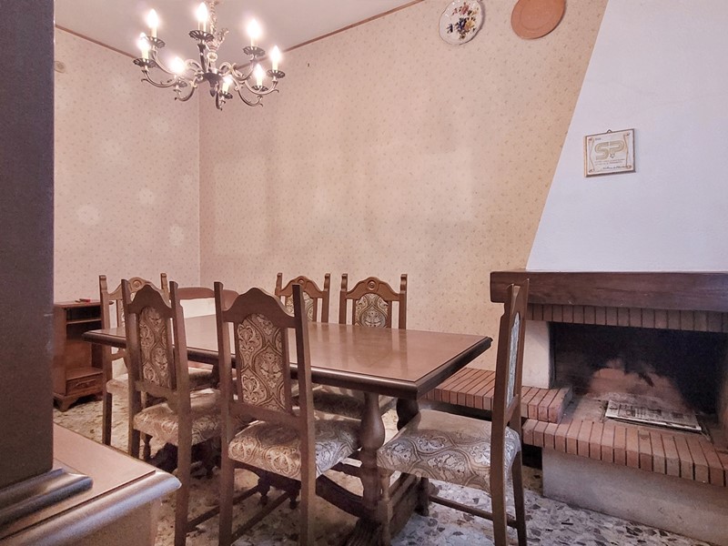 Il primo piano di circa 107 mq è organizzato in ingresso su corridoio, sala da pranzo con camino, cucinino con camino, salone con balcone lato sud, due camere da letto di cui una matrimoniale, un bagno.
