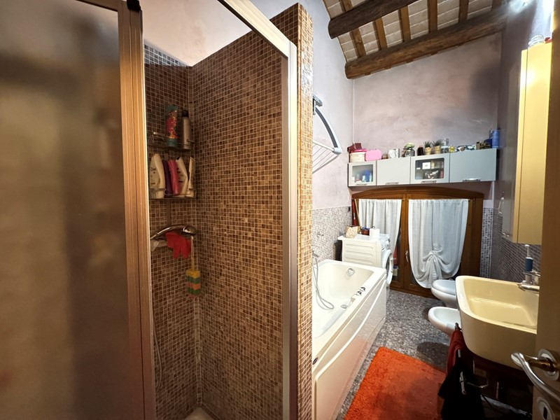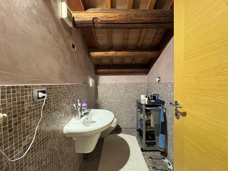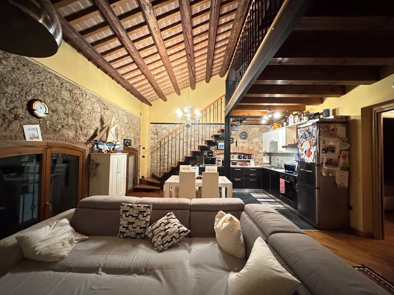 Al piano superiore, un soppalco che si affaccia sulla zona living, ospita una terza camera da letto e un secondo bagno, ideale per la privacy e per ospiti. Il soppalco, anch'esso con travi a vista, aggiunge un ulteriore elemento di fascino e funzionalità, sfruttando al meglio lo spazio disponibile.