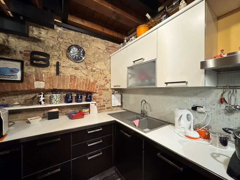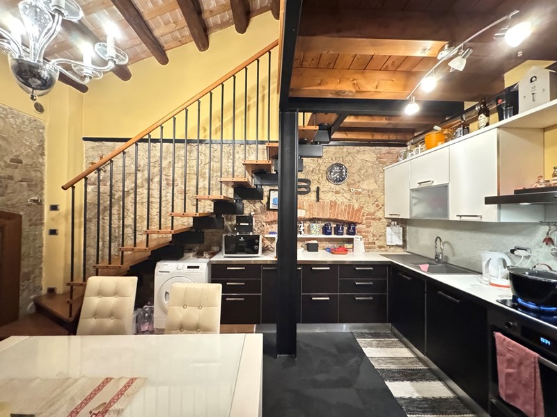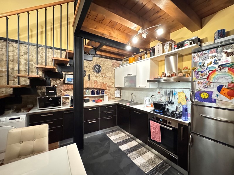 L'appartamento si sviluppa su due livelli. Al piano principale troviamo un ampio soggiorno con cucina a vista in open space, creando un ambiente ideale per la convivialità. Le pareti, rifinite con dettagli in facciavista, arricchiscono l'appartamento conferendo un tocco rustico e al tempo stesso moderno.