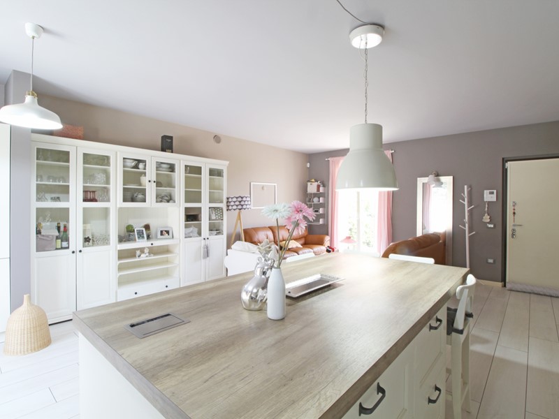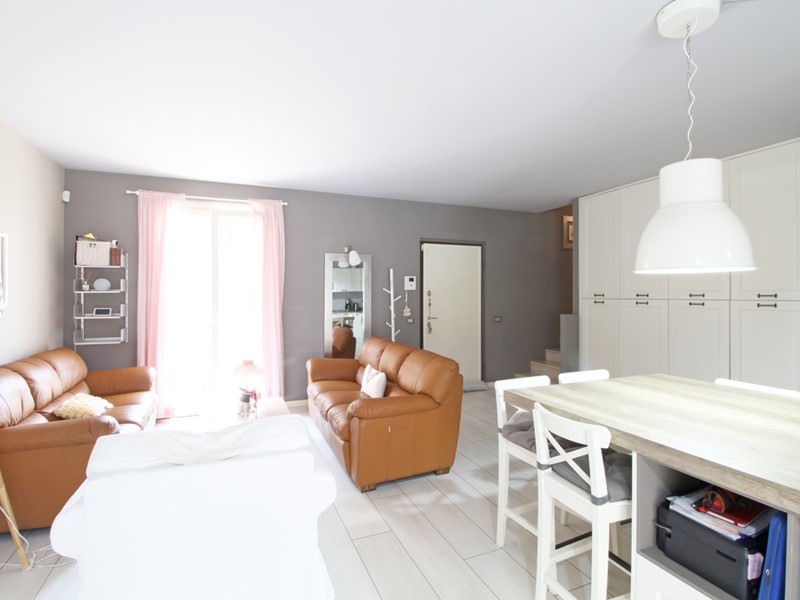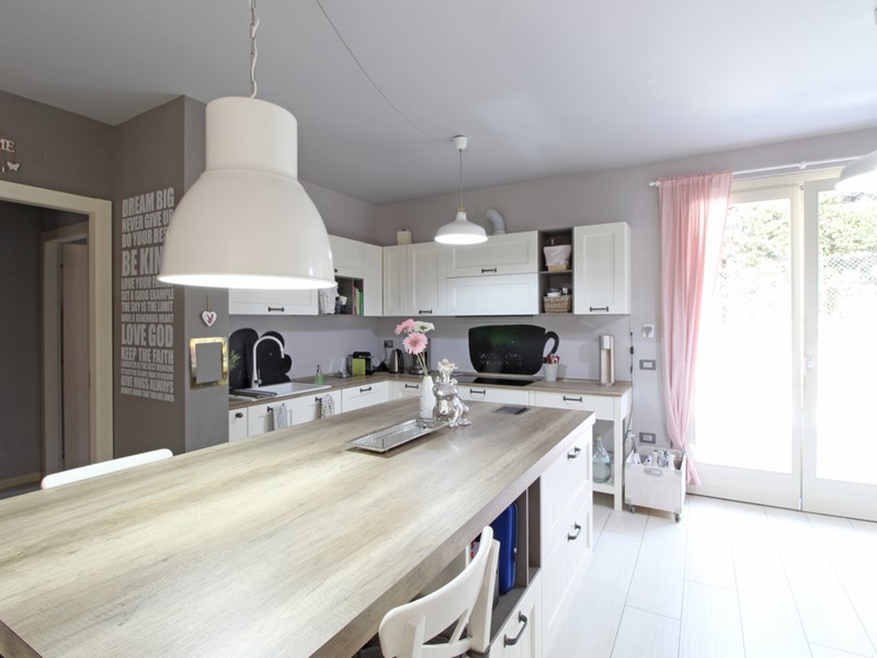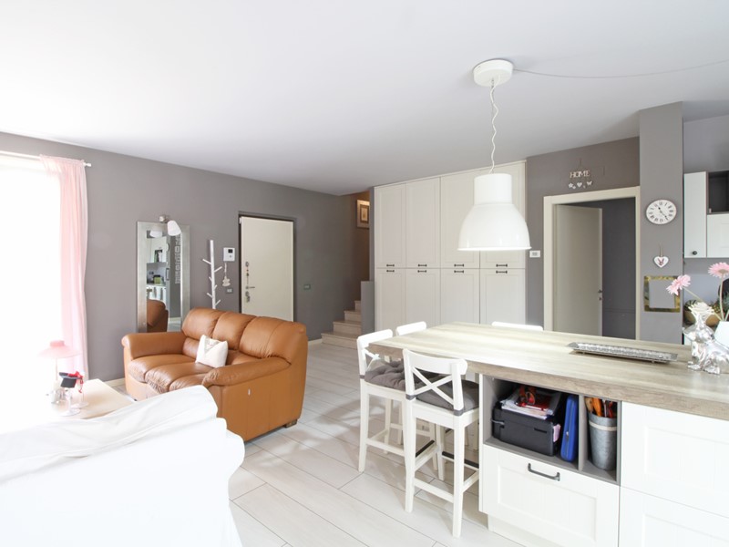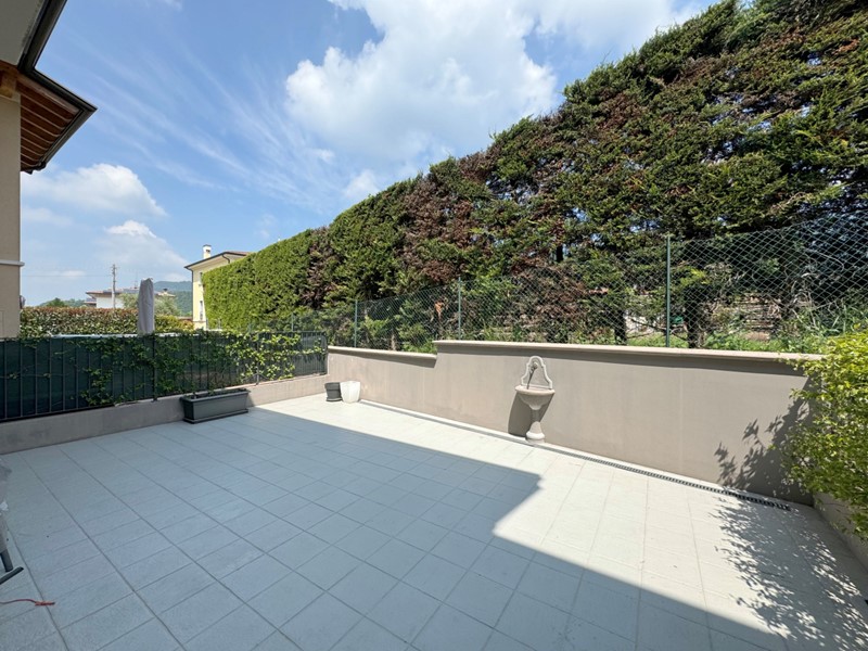 La casa è così composta: l'accesso avviene tramite un giardino privato su cui affaccia la grande e luminosa zona giorno con ampio spazio cucina separabile; una porta finestra conduce al secondo spazio esterno pavimentato di oltre 40 mq; completa il piano terra un comodo bagno di servizio.