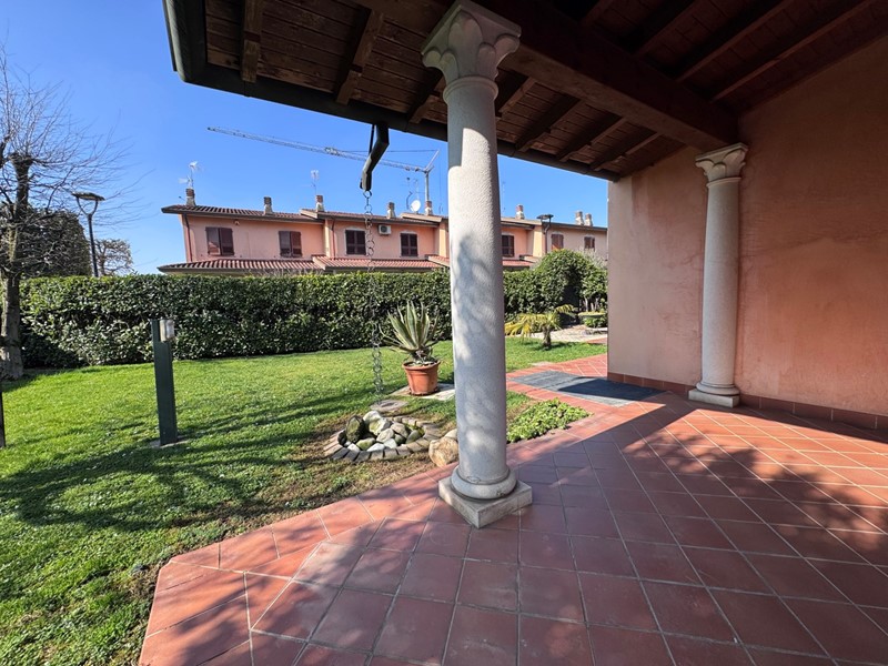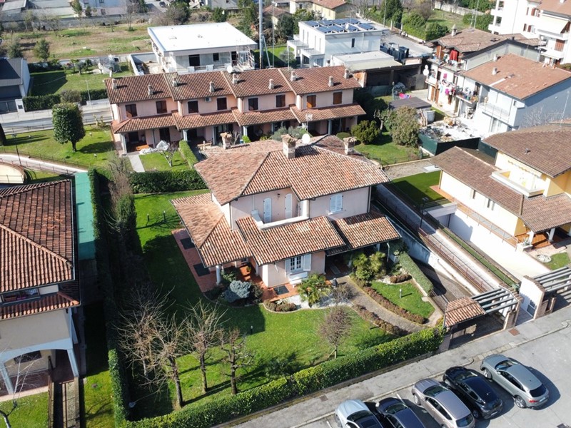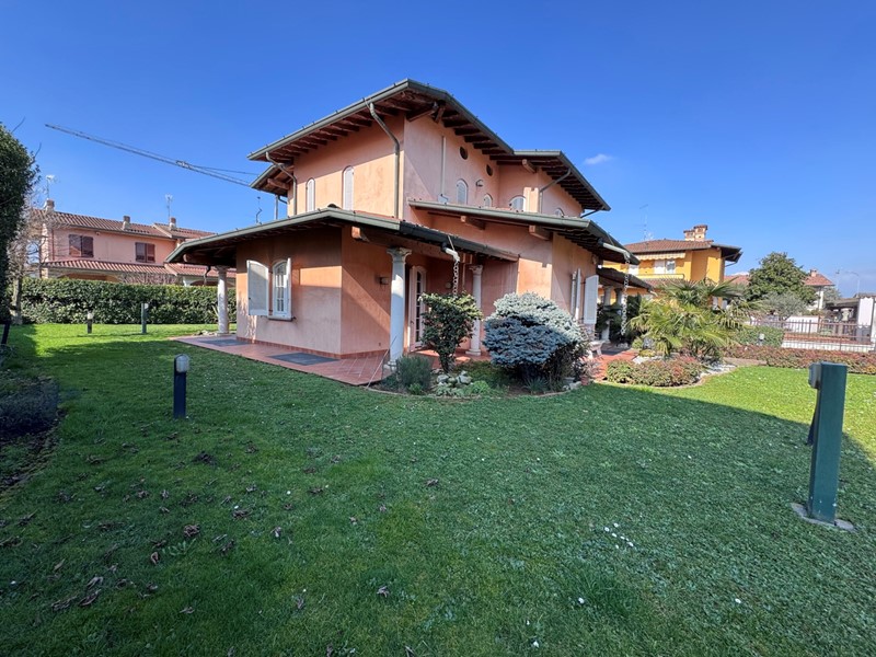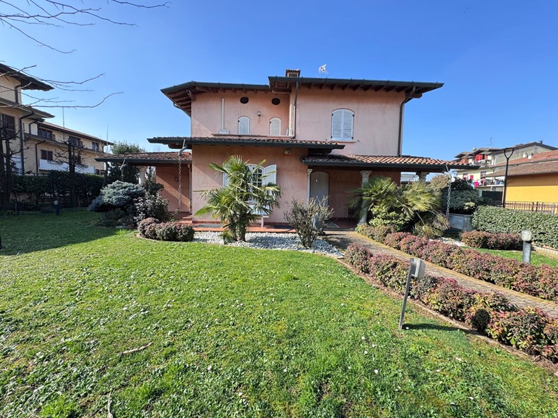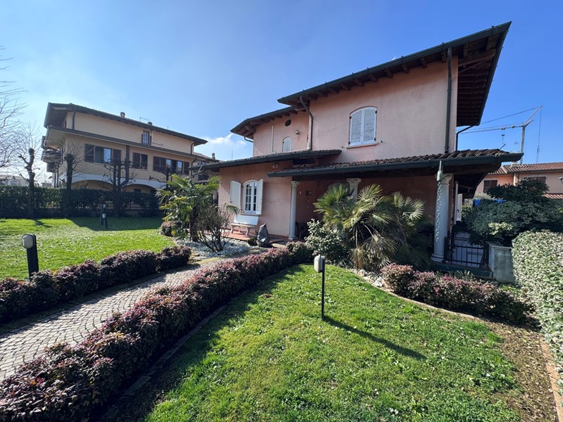 Il giardino privato circostante è curato e ben tenuto, offrendo un'oasi di tranquillità e privacy. Tre box auto e un ripostiglio forniscono ampio spazio per il parcheggio e lo stoccaggio.