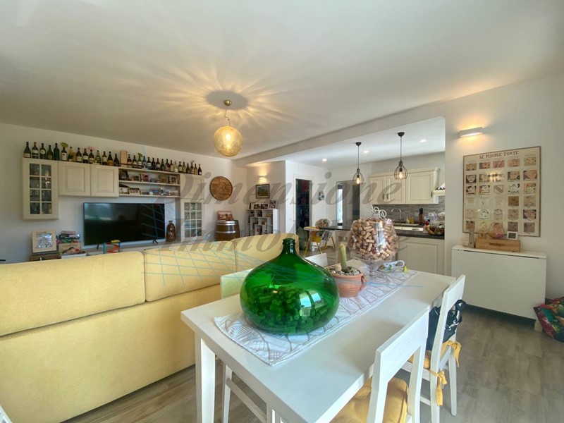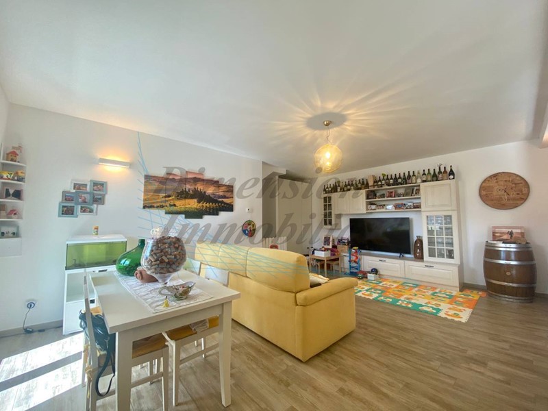 Ampia zona giorno con un luminoso soggiorno e cucina a vista, ideale per accogliere amici e familiari in un ambiente accogliente