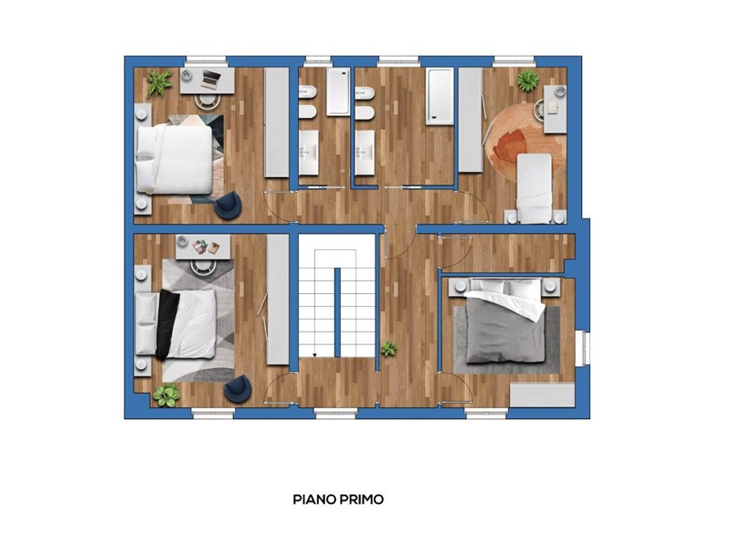 Al piano superiore si sviluppa il reparto notte composto dalle quattro camere (di cui tre matrimoniali ed una camera media) oltre ai due bagni, entrambi dotati di finestra ed al comodo ripostiglio.