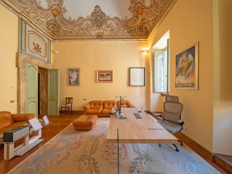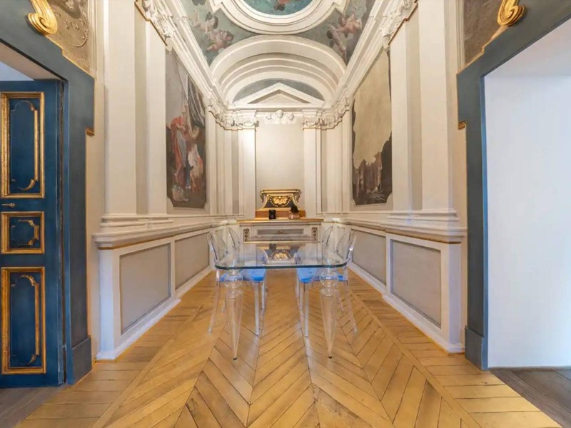 Internamente l'appartamento è composto da ampio ingresso, due luminosi e spaziosi saloni interamente affrescati e per quali è stata posta particolare attenzione nel preservare l’opera originale attraverso un meticoloso e attento restauro conservativo; una grande cucina abitabile con adiacente locale lavanderia ed un suggestivo disimpegno che ci accompagna al bagno di servizio ed al reparto notte.