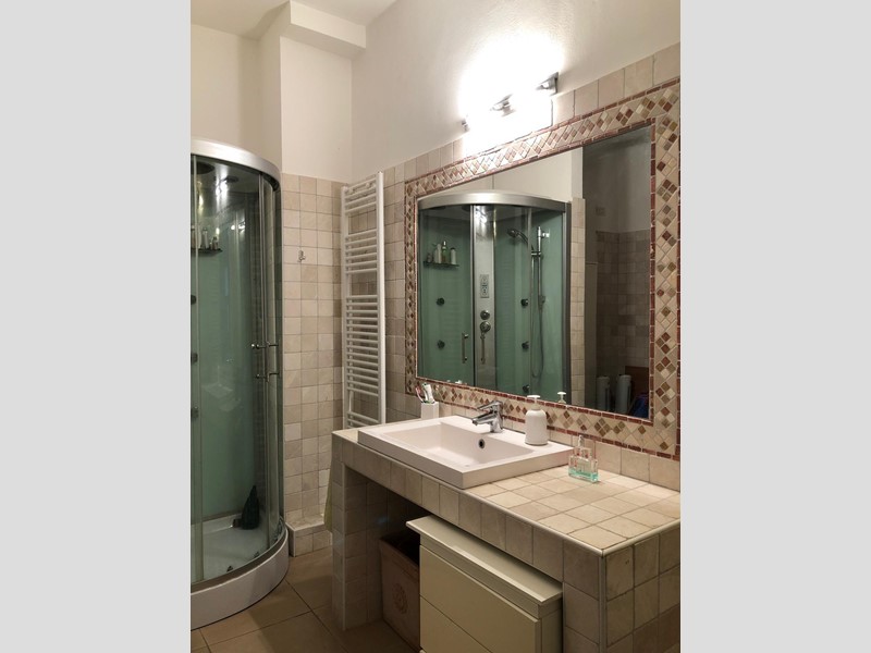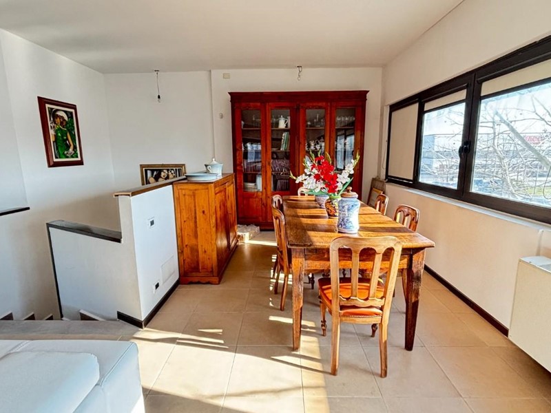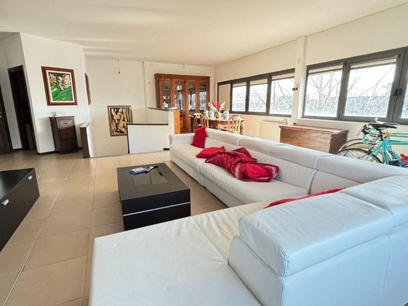 Porzione di immobile costituito da un appartamento per civile abitazione di circa mq. 200 con attiguo un locale uso laboratorio o magazzino completo di ufficio e bagno della superficie di mq. 150. L'appartamento si articola su due piani: al p. terra si trova un ampio soggiorno con zona cottura e ripostiglio, mentre al p.1° al quale vi si accede mediante scala a giorno si trova un doppio salone di circa mq. 50, studio, disimpegno notte, due camere delle quali una con bagno privato e bagno. Il tutto corredato di resede esclusivo recintato sui due lati con relativi posti auto.