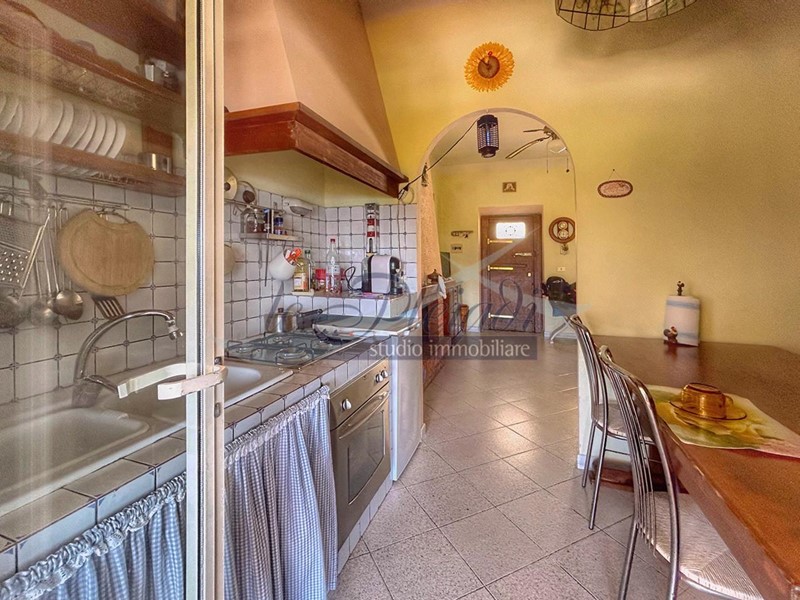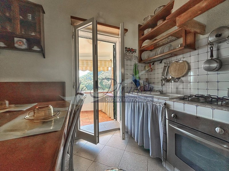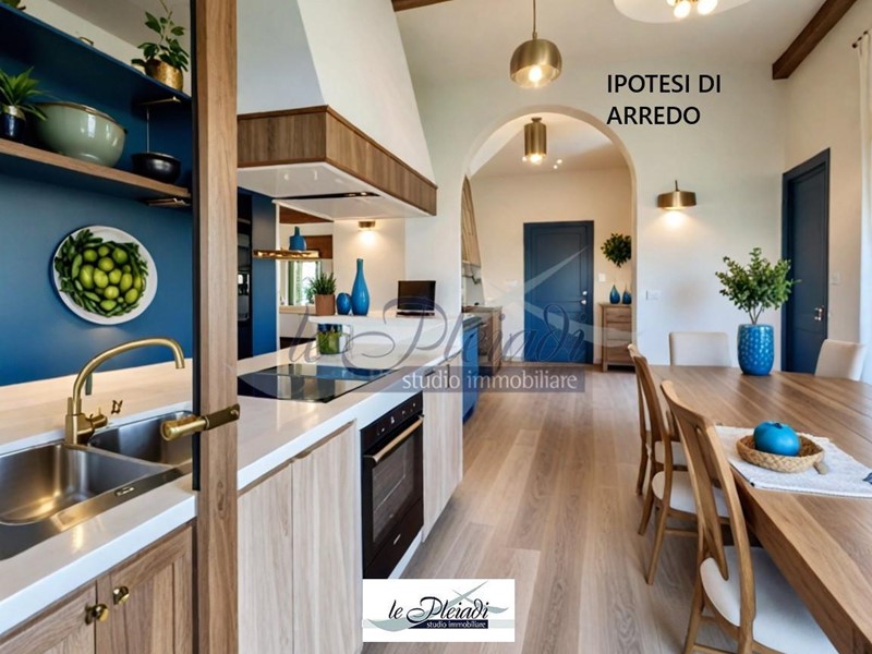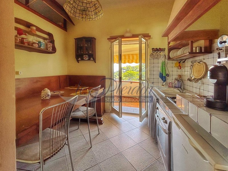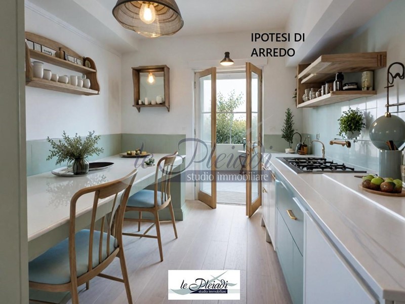 La cucina abitabile offre un accesso diretto a una spaziosa terrazza attrezzata, perfetta per cene all'aperto con amici e familiari.