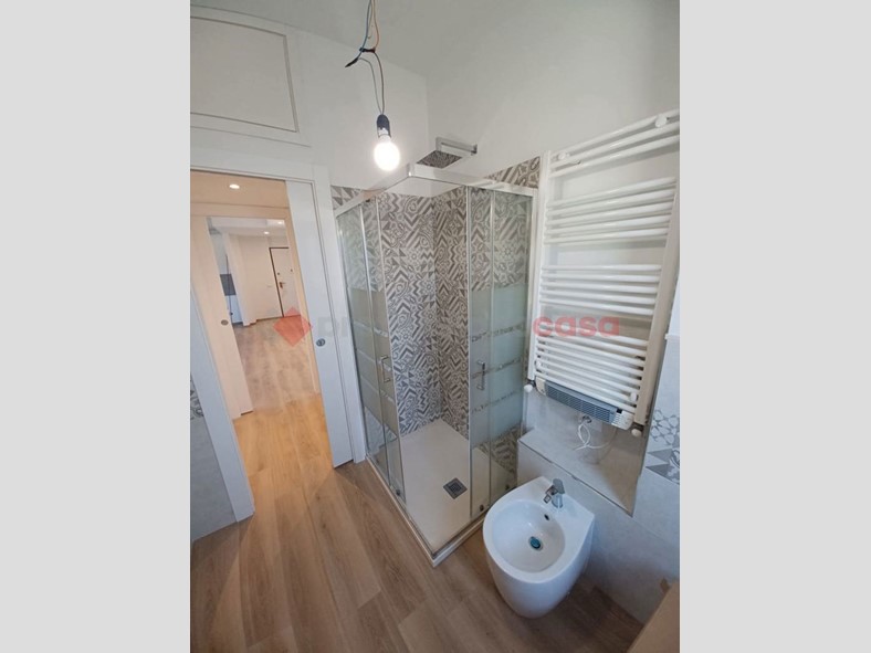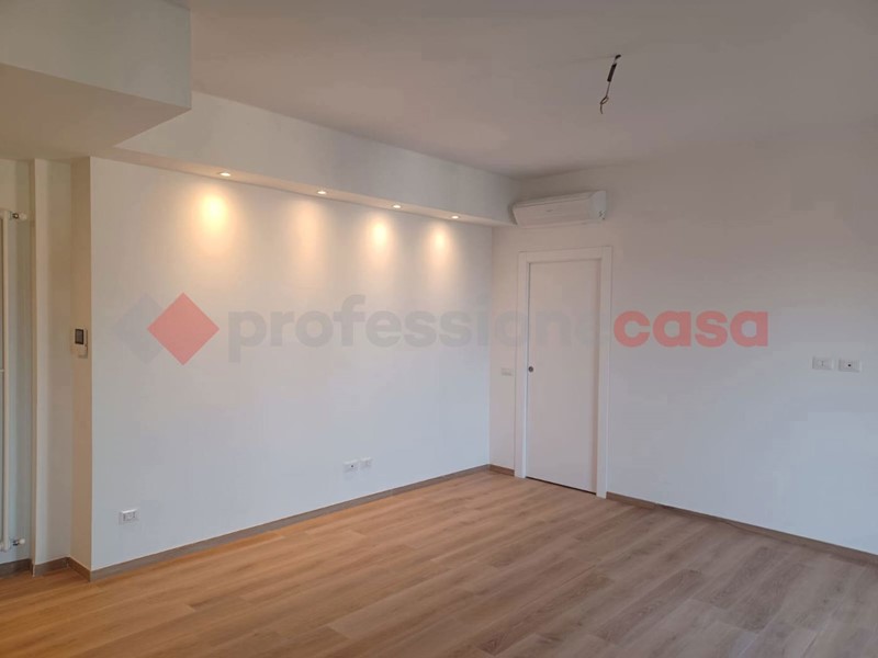 Ingresso nella zona living composta da ampio soggiorno con angolo cottura e accesso al balcone. Abbassamenti con faretti: disimpegno accessoriato da attacchi per lavatrice e asciugatrice; la zona notte è composta da una camera matrimoniale e dal servizio con box doccia.