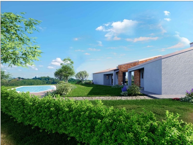 La nuova villetta verrà ubicata all'interno di un bellissimo giardino con meravigliosa vista panoramica, con accesso pedonale e cancello carrabile, inoltre il progetto prevede la realizzazione di una zona a parcheggio con pergolato in legno con sovrastanti pannelli fotovoltaici e una bella piscina.
