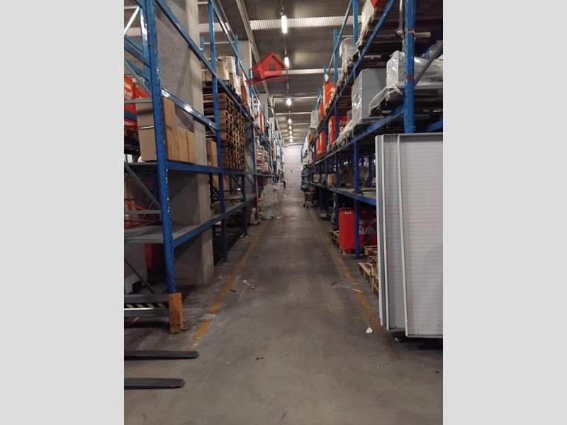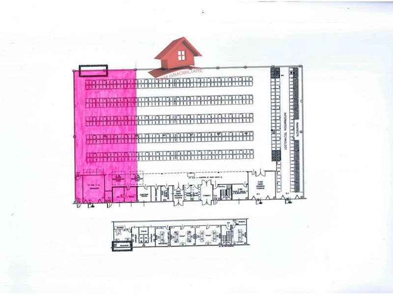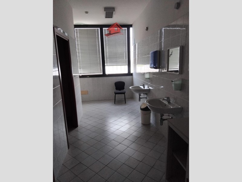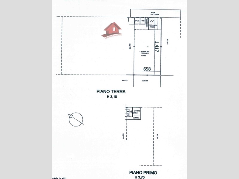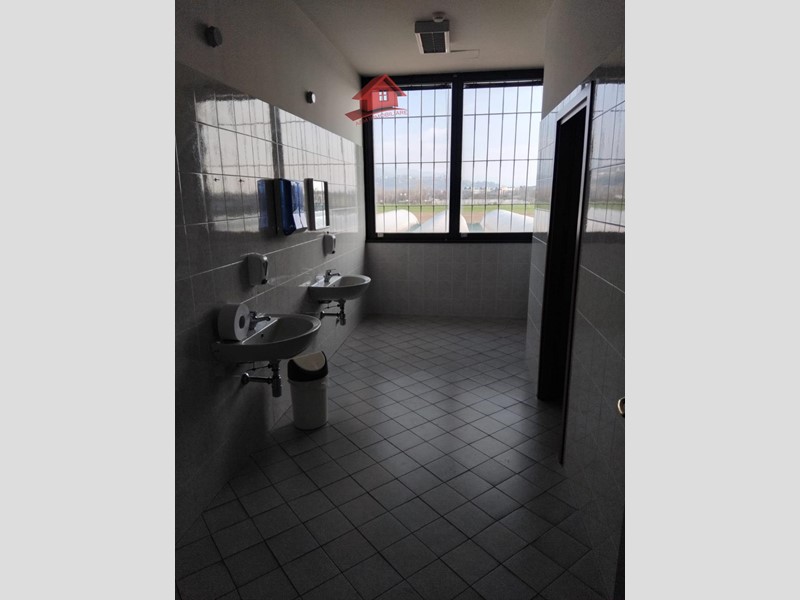 Ingresso carrale che serve anche le altre attività adiacenti, piano terra deposito servito da spogliatoio e bagno, al piano superiore uffici con ripostiglio e bagno.