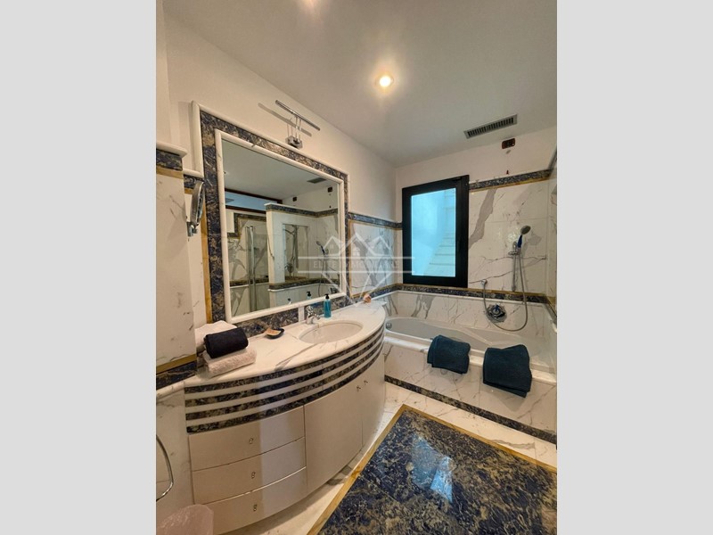 - Bagno di lusso interamente in marmo, dotato di doccia, vasca e finestra.