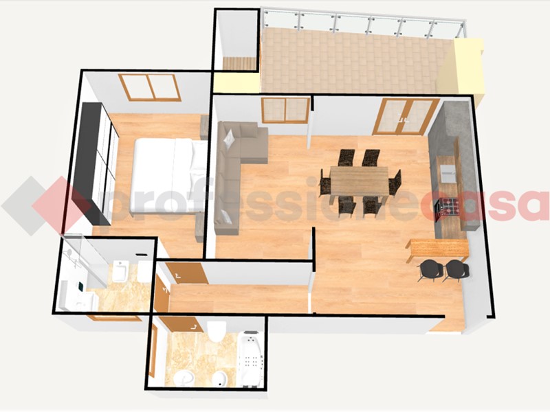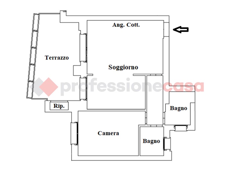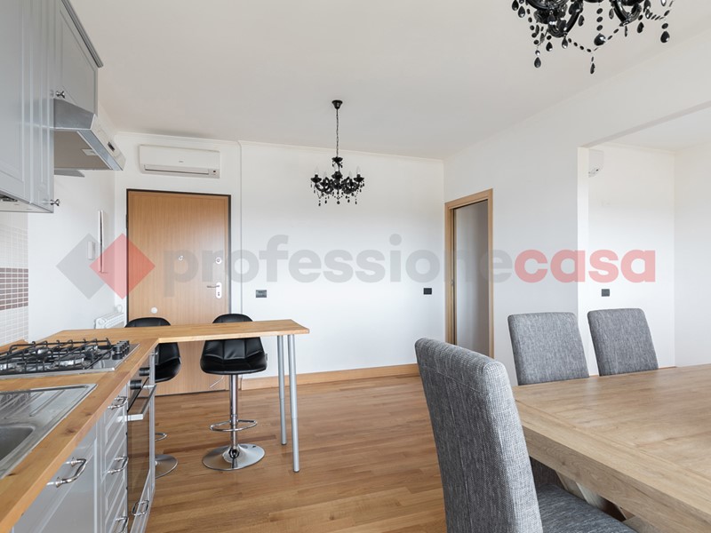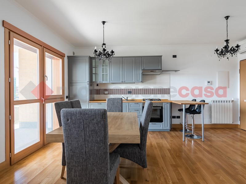 L'appartamento è composto da un'ampia zona living a vista (30 mq) con angolo cottura, una comoda camera da letto matrimoniale, un disimpegno, due bagni ed un terrazzo di 20 mq con un utile ripostiglio/lavanderia. Il Posto Auto scoperto è di 12 mq; la Cantina è di 4 mq.