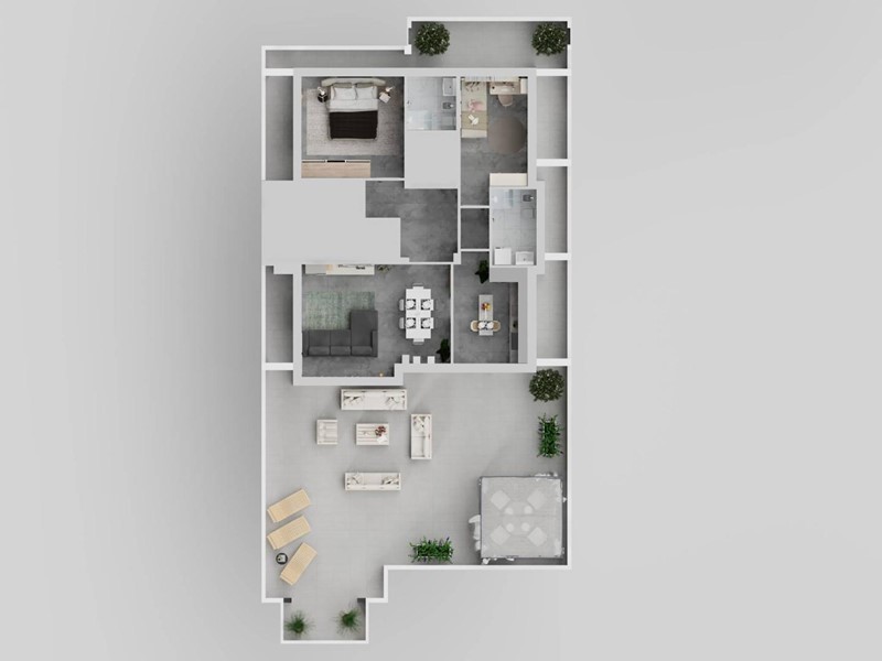La spaziosa zona giorno, caratterizzata da un luminoso soggiorno e una cucina abitabile, si apre direttamente sul terrazzo, creando un'area perfetta per rilassarsi e godersi la vista. La zona notte, pensata per garantire massimo comfort, include due camere da letto e due bagni finemente rifiniti. A completare la proprietà, una pratica cantina al piano interrato.