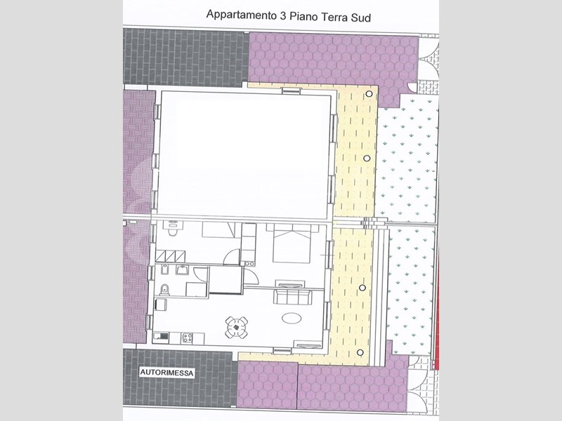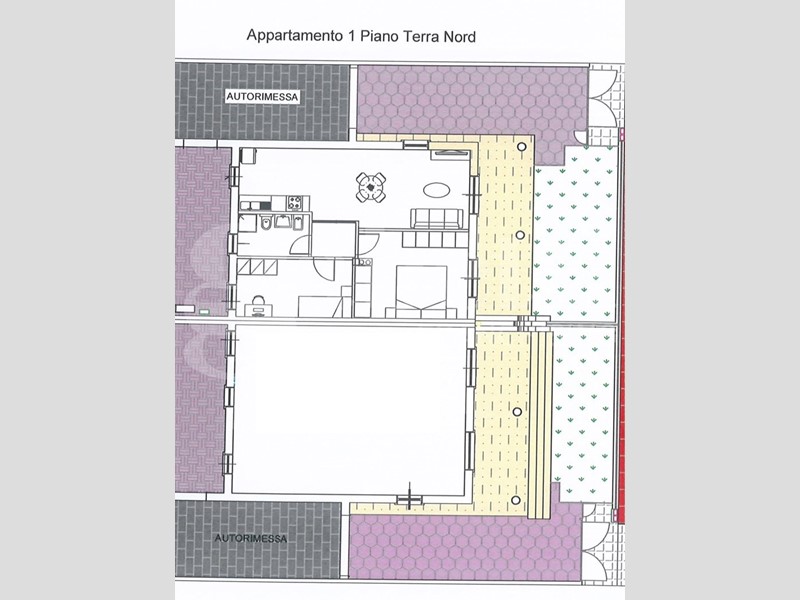 L'immobile al piano terra sarà cosi composto: ingresso su soggiorno con angolo cottura, una camera matrimoniale, una cameretta, un bagno finestrato, terrazzi e giardino.