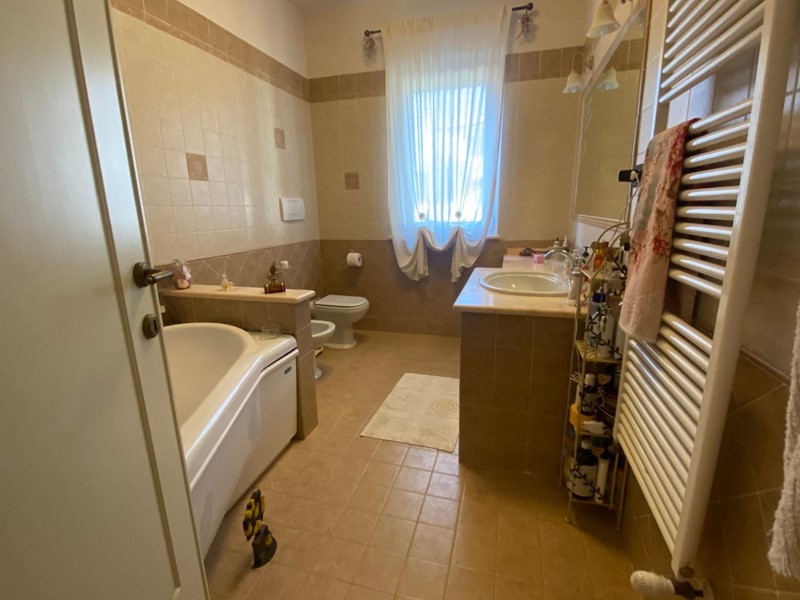 Salendo al primo piano, l'appartamento offre un ampio soggiorno con balcone, un tinello con angolo cottura, due camere matrimoniali e un bagno. La villa è circondata da un incantevole giardino di 1.000 m² con due ingressi carrabili, offrendo la possibilità di dividere la proprietà in due porzioni separate. Le facciate e gli infissi sono stati recentemente rifatti grazie alle agevolazioni del 110%, garantendo efficienza energetica e comfort.