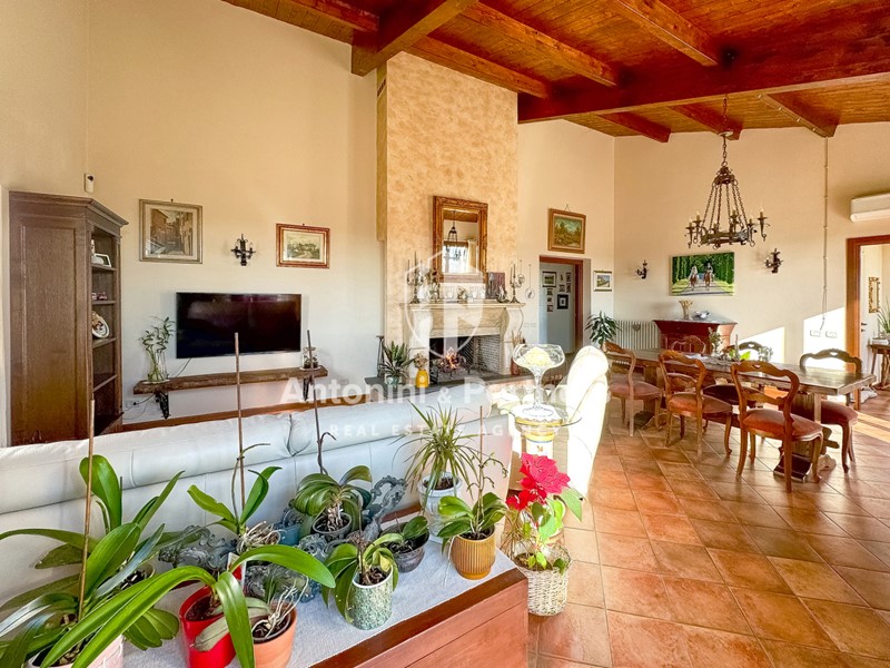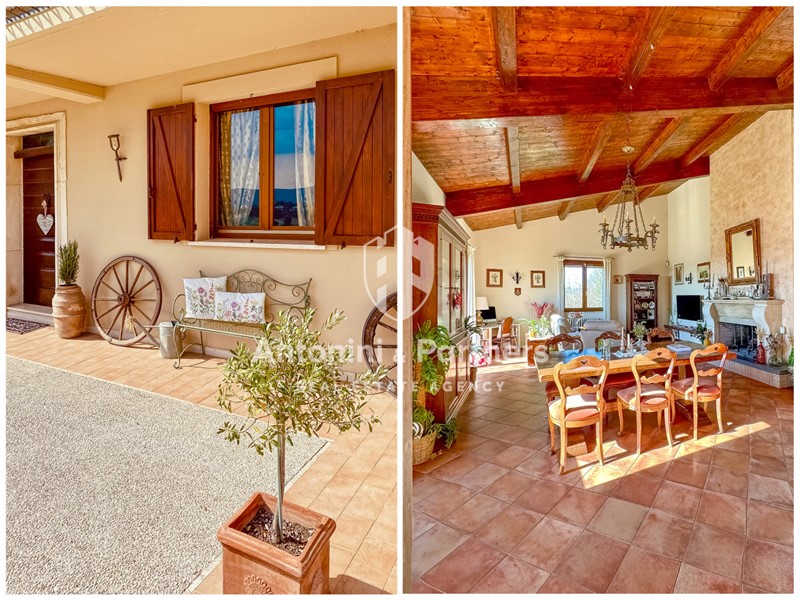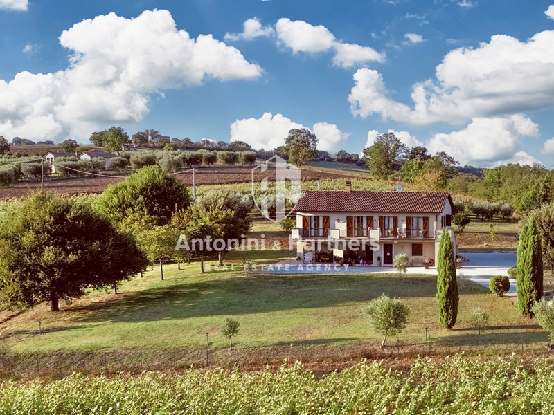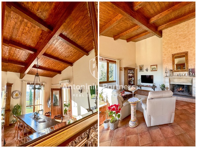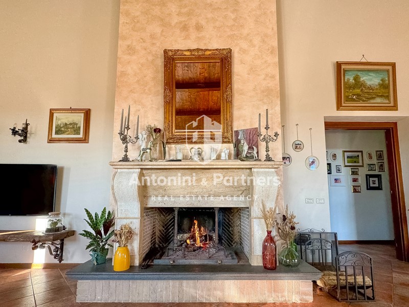 Il casale è stato completamente ricostruito nel 2002 con materiali di recupero e criteri anti sismici. Esternamente presenta eleganti facciate intonacate, portico e terrazzo panoramico. Interamente, ambienti spaziosi e molto luminosi, pavimenti in cotto, soffitti in legno e camini in pietra.