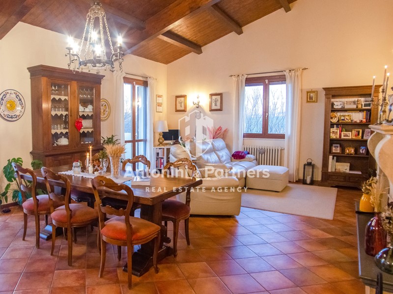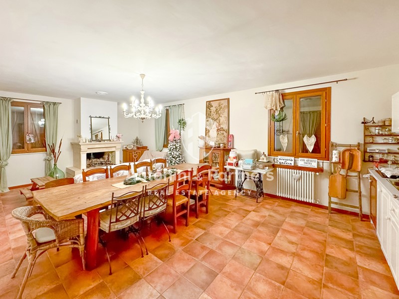 - L'abitazione padronale, posta al primo piano che si compone di: cucina abitabile, grande salone (50 mq) con camino e accesso diretto al terrazzo, tre spaziose camere da letto e due bagni.
