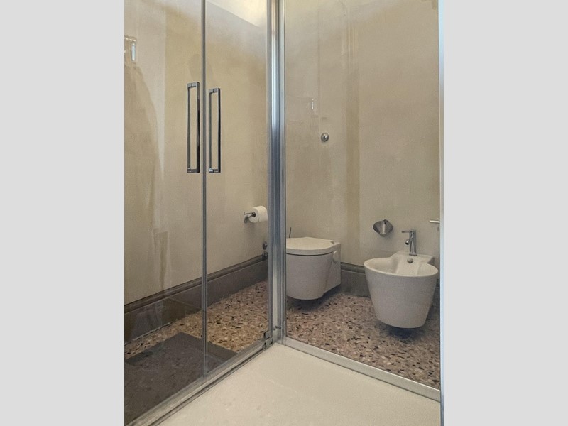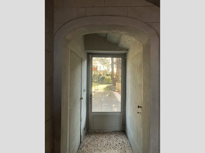 L'accesso principale, su strada cittadina, conduce a un ampio androne che funge da distributore: da qui si accede direttamente al parco retrostante e, mediante una scalinata in pietra, si raggiunge il piano superiore. La proprietà è strutturata in due appartamenti indipendenti, uno per piano.