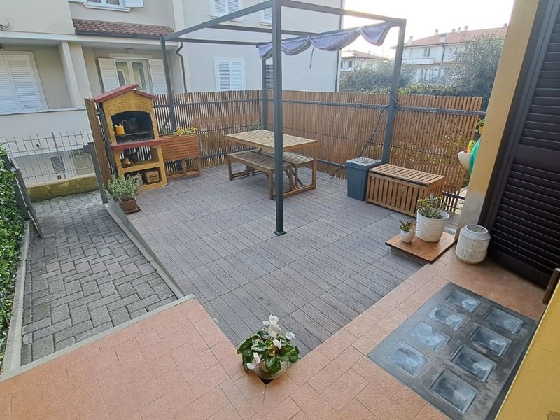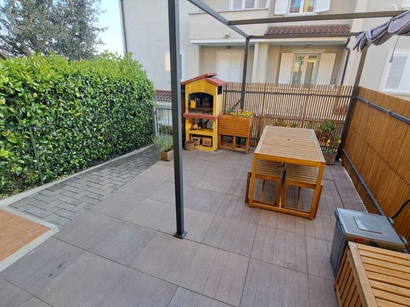 Rosignano S. in Villetta a  schiera di recente costruzione vendiamo Appartamento al piano terra rialzato con ingresso indipendente e piacevole giardino esclusivo completamente riqualificato con piastrelle, punti luce e gazebo. L’appartamento è composto da bel soggiorno-pranzo con angolo cottura e camino angolare in vetro con ampia finestratura che affaccia sul giardino, disimpegno notte, 1camera matrimoniale con terrazzo, 1 camerina anch’essa con terrazzo, bagno e ripostiglio ad uso lavanderia.