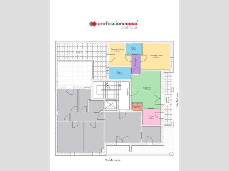 L'immobile si trova all'interno di un esclusivo condominio composto da sole sei unità abitative, due per piano, servito da ascensore. L'appartamento, posto al piano rialzato con affaccio su Via Toscana, ha una superficie commerciale di 105 mq, di cui 75,50 mq interni.