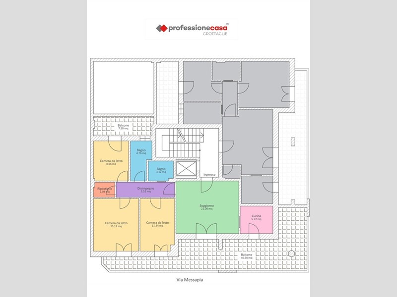 L'immobile si trova all'interno di un esclusivo condominio composto da sole sei unità abitative, due per piano, servito da ascensore. L'appartamento, situato al secondo piano con affaccio su Via Messapia, ha una superficie commerciale di 142 mq, di cui 95,70 mq interni.