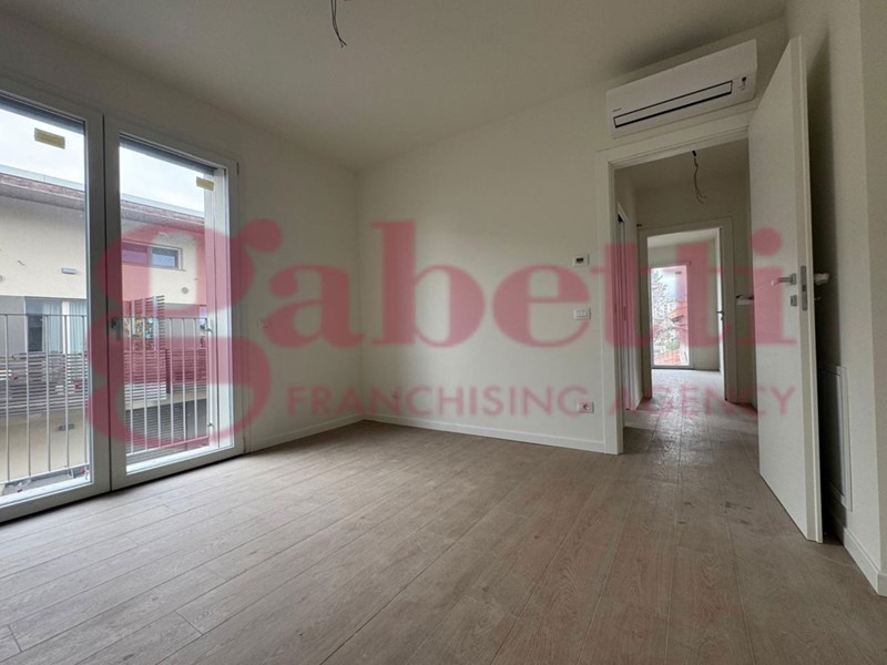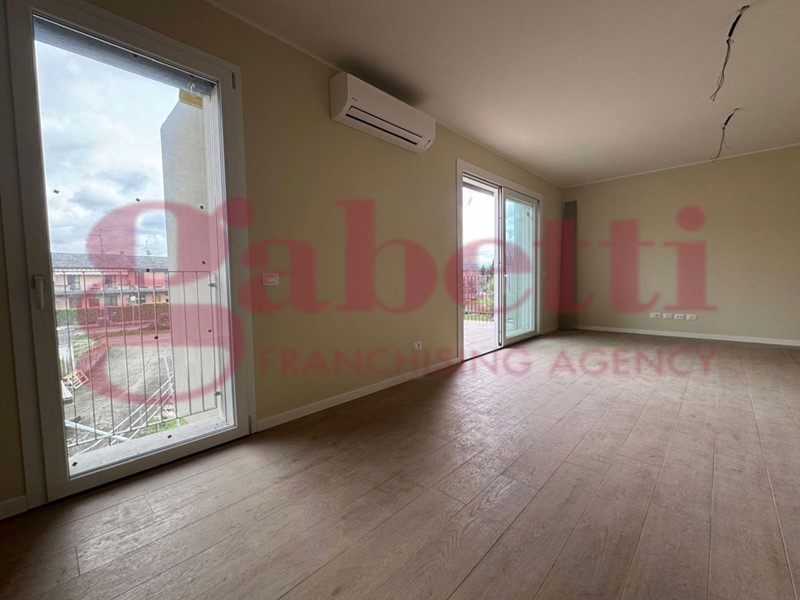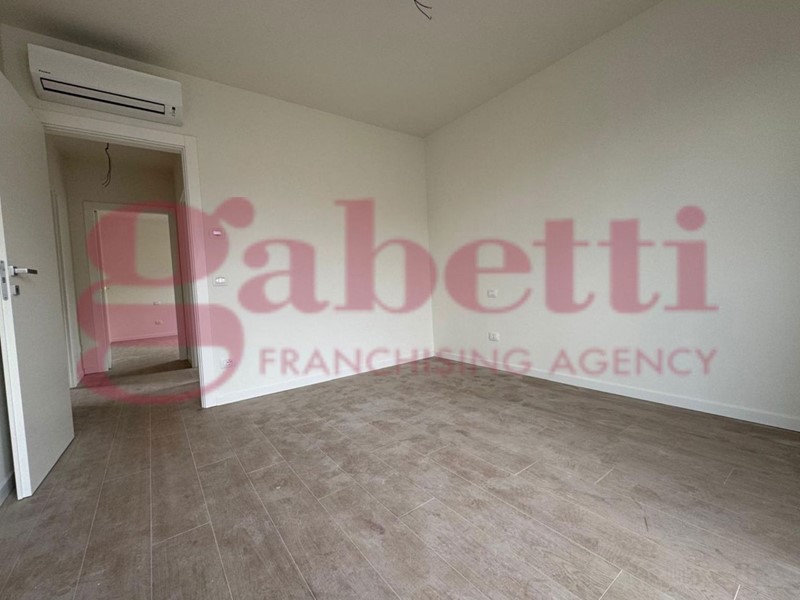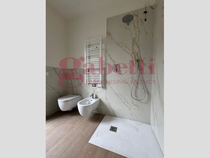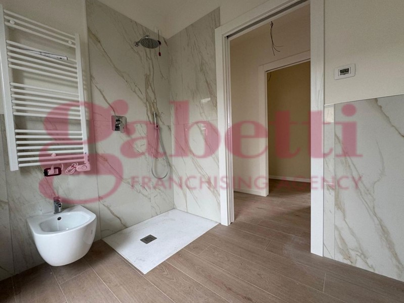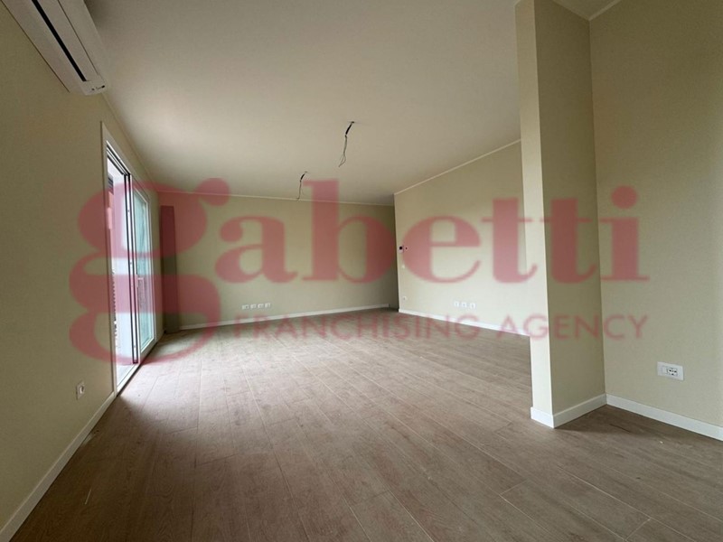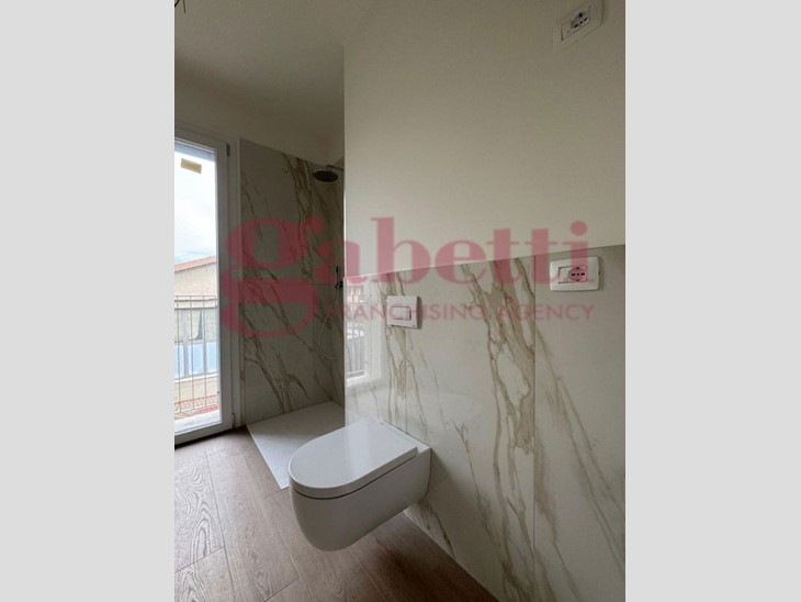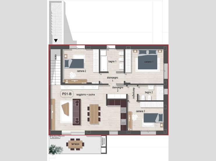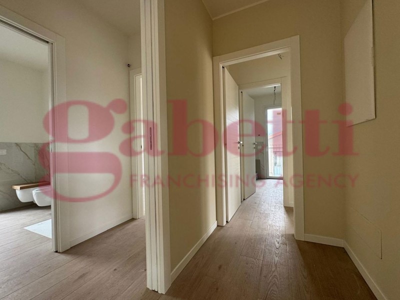 L'appartamento, in posizione di testa, ha affacci su tre lati e presenta un ingresso con una breve rampa di scale che introduce ad un luminosissimo open space con cucina a vista e terrazzo vivibile, attrezzato con armadiatura ad incasso. La zona notte si articola su due disimpegni autonomi: il primo serve un'ampia camera singola/camera ospiti con bagno; il secondo conduce alla camera matrimoniale e ad un'altra camera singola di ampia metratura, oltre al secondo bagno, di generose dimensioni. Entrambi i bagni sono dotati di attacchi per la lavatrice.