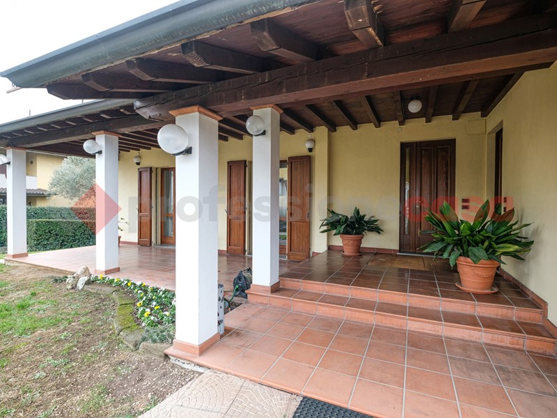 Dal cancellino d'ingresso, si è accolti da un grazioso vialetto che conduce al porticato, da cui si accede all'interno dell'abitazione al piano terra, appena entrati un ampio ingresso ci accompagna nel salone elegante ed accogliente dotato anche del camino, la cucina è separata ed è molto grande, una piccola scalinata di soli tre gradini ci porta nel reparto notte dove ci sono tre camere da letto, con due bagni, di cui uno all'interno di una delle camere.