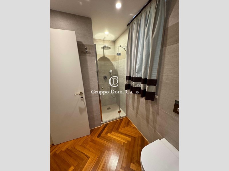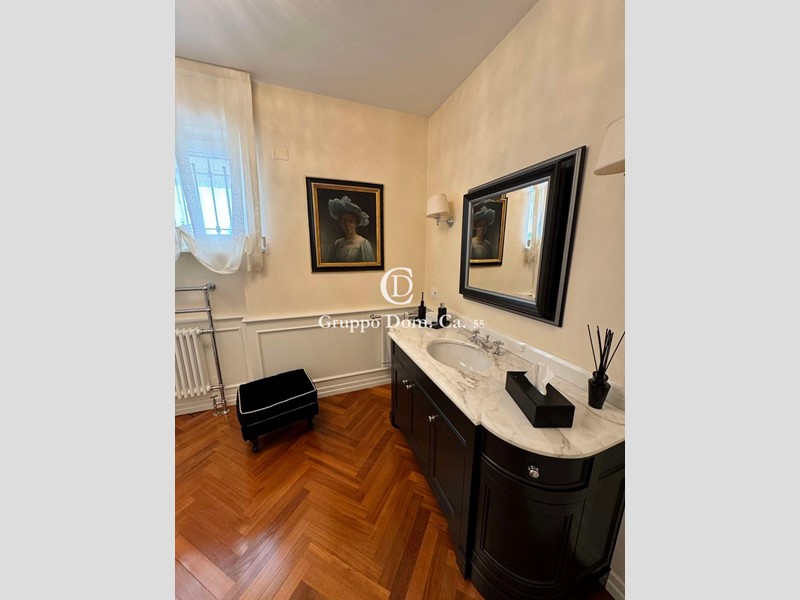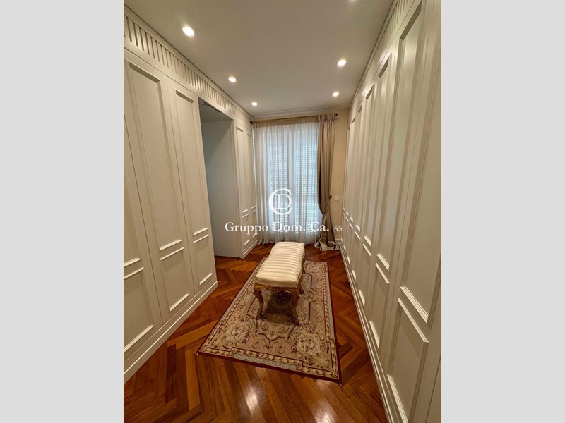 Una scala con boiserie in legno conduce al primo piano, dove si sviluppa la zona notte. La suite padronale dispone di bagno privato, cabina armadio e accesso diretto a una terrazza panoramica. Completano il piano due camere matrimoniali, entrambe con bagno en suite e armadiature su misura.