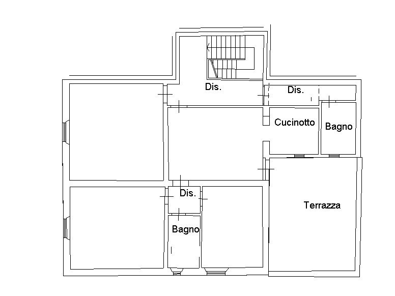 ingresso, ampio soggiorno, ampia zona pranzo con cucinotto separato con affaccio su AMPIA TERRAZZA di 30 mq. ca, disimpegno, 2 camere, 2 bagni, ripostiglio e cantina.