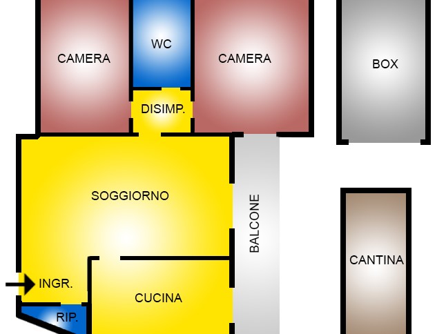 L'immobile è composto da un ingresso, un ampio soggiorno luminoso, una cucina abitabile, un disimpegno, due camere da letto, un bagno, un ripostiglio, un balcone, due cantine e un box auto. Il riscaldamento è autonomo, permettendo una gestione indipendente dei consumi.