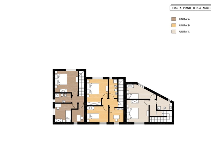 L'unità "C" è composta da soggiorno con cucina a vista, disimpegno, bagno e camera al piano terra e due camere, disimpegno e bagno al piano primo.