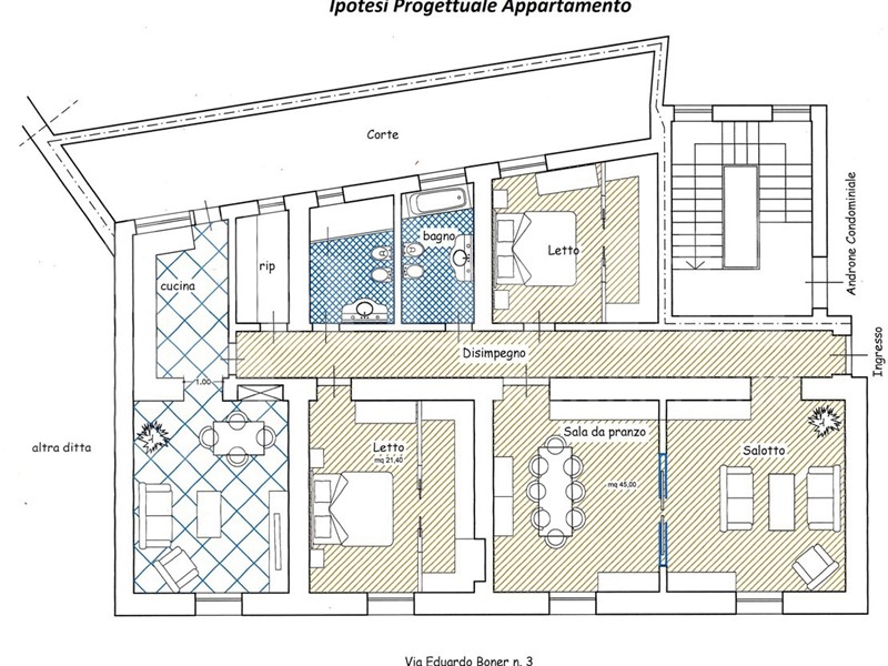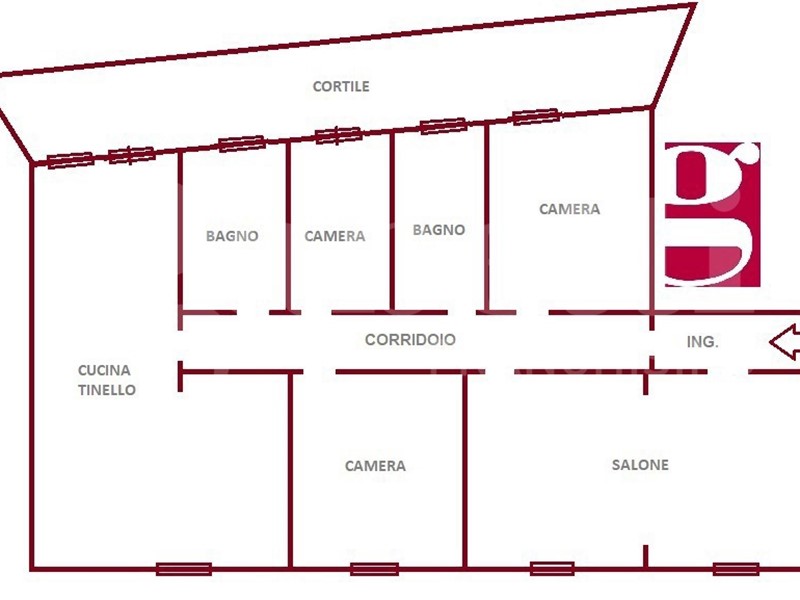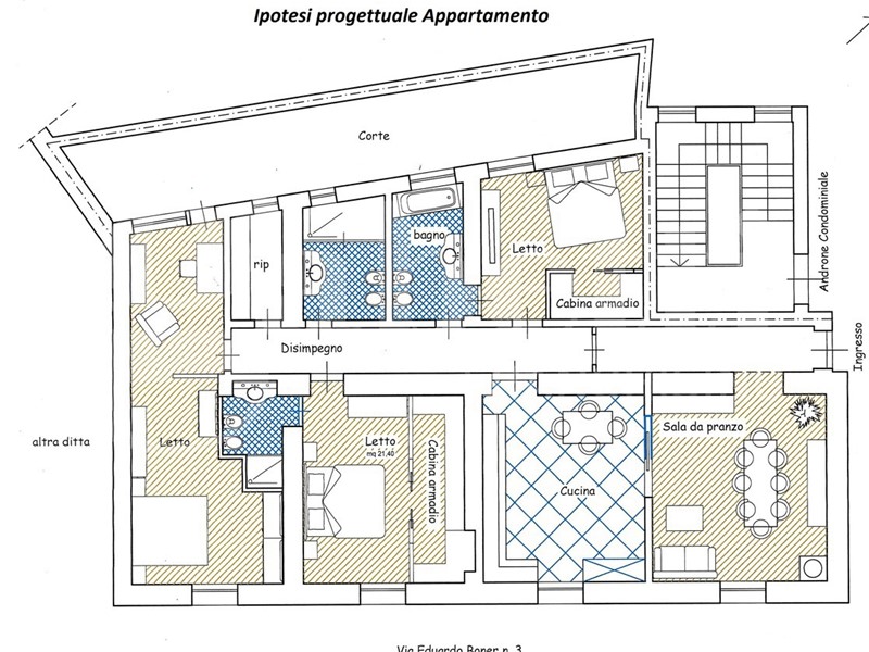 L'appartamento ha esposizione sulla via principale con ben quattro finestre e la composizione interna è comoda e lineare: il corridoio divide fin dall'ingresso tutti gli ambienti a destra e a sinistra e troviamo un luminoso salone doppio, tre camere da letto, un'ampia cucina tinello e i doppi servizi. Completa la proprietà un cortile di circa 40 mq con esposizione più riservata.