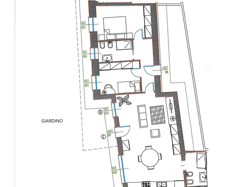 Al piano terra appartamento composto da ampio soggiorno con cucina a vista da cui si accede all'area esterna di proprietà oltre al bagno che serve la zona giorno. Mentre nella zona notte, che rimane ben divisa, troviamo due camere e bagno.