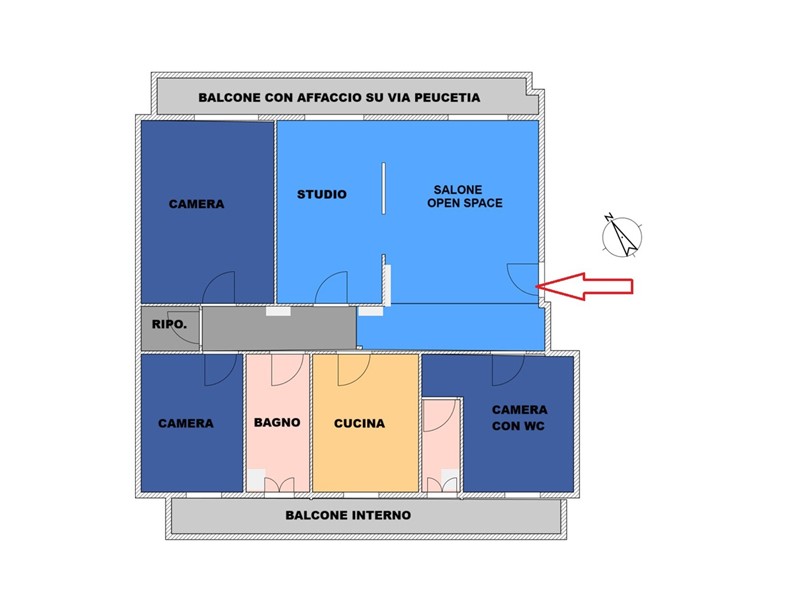 La pianta è molto regolare e funzionale. L'ingresso ci conduce nel salotto open space con accesso sul balcone fronte via Peucetia; una porta scorrevole lo separa da uno studio altrettanto luminoso e con accesso al balcone; la cucina risulta abitabile ed è servita da un bel balcone affacciato sul giardino interno. Una camera presenta un bagno interno, le altre due hanno dimensioni generose. Un secondo bagno ed un ripostiglio completano l'interno.