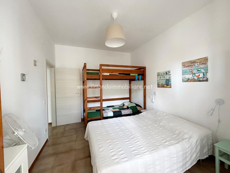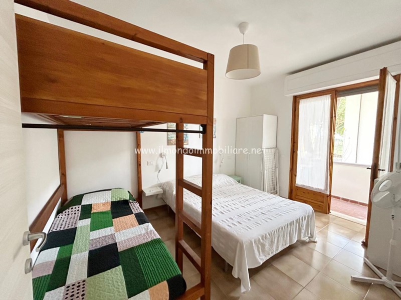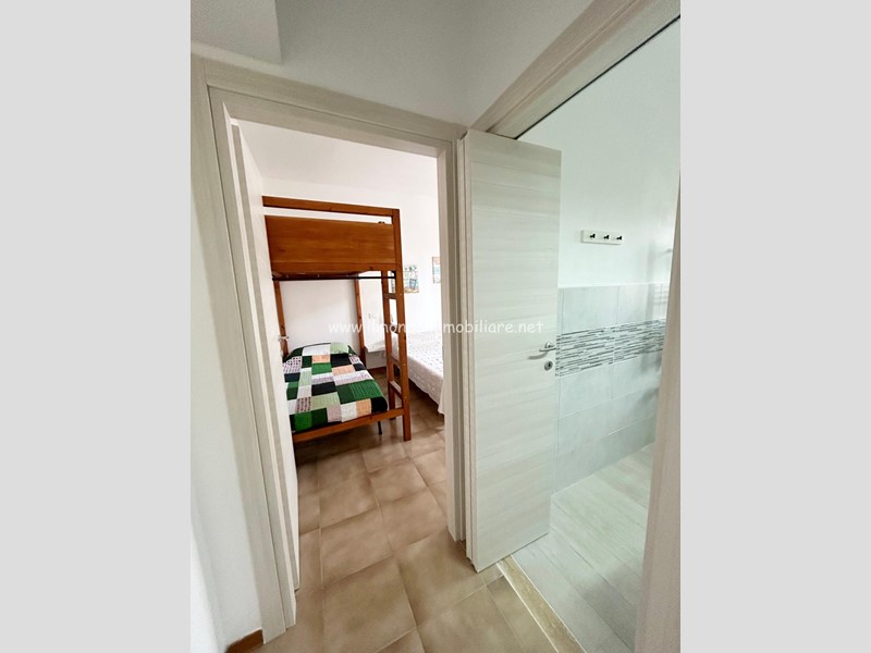 Cucina soggiorno con divano letto affacciato sul balcone, bagno nuovo con cabina doccia, camera matrimoniale con letto alla francese e letto a castello.