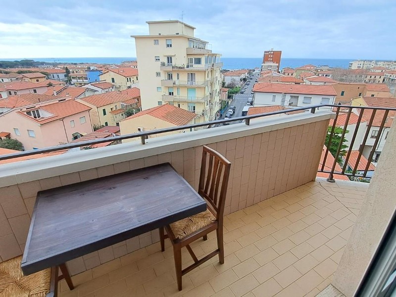 Rosignano Mare ampio Appartamento panoramico con vista Mare al 5 piano servito da ascensore composto ingresso- cucinotto con lavastoviglie e lavatrice - ampia sala - ingresso- 2 camere matrimoniali - bagno con doccia - terrazzo che circonda la casa con bella vista mare - al piano seminterrato possibilita' di ricovero bici - 4 posti letto- climatizzato.
