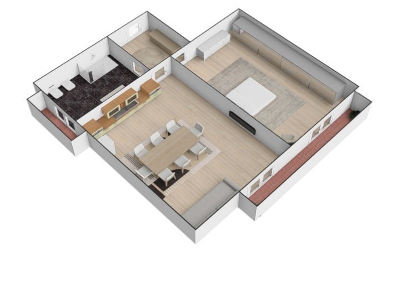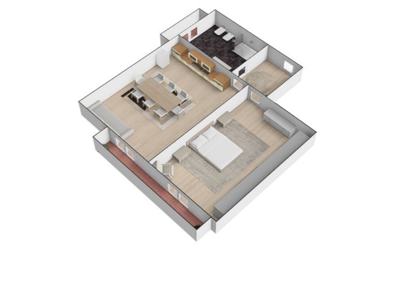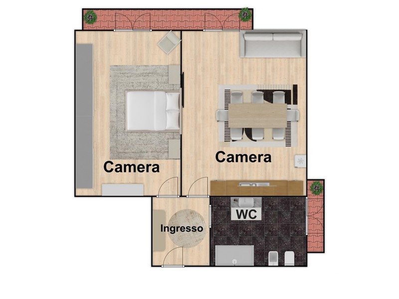 Con una superficie di circa 64 mq, di cui 57 mq interni e 6 mq esterni, l'appartamento è composto da: ingresso, 2 camere, cucinotto e bagno