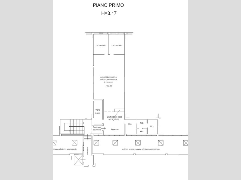 E' composto da : un vano principale, due stanze, un vano tecnico vicino all'ingresso e la zona servizi nella parte di fronte all'ingresso.